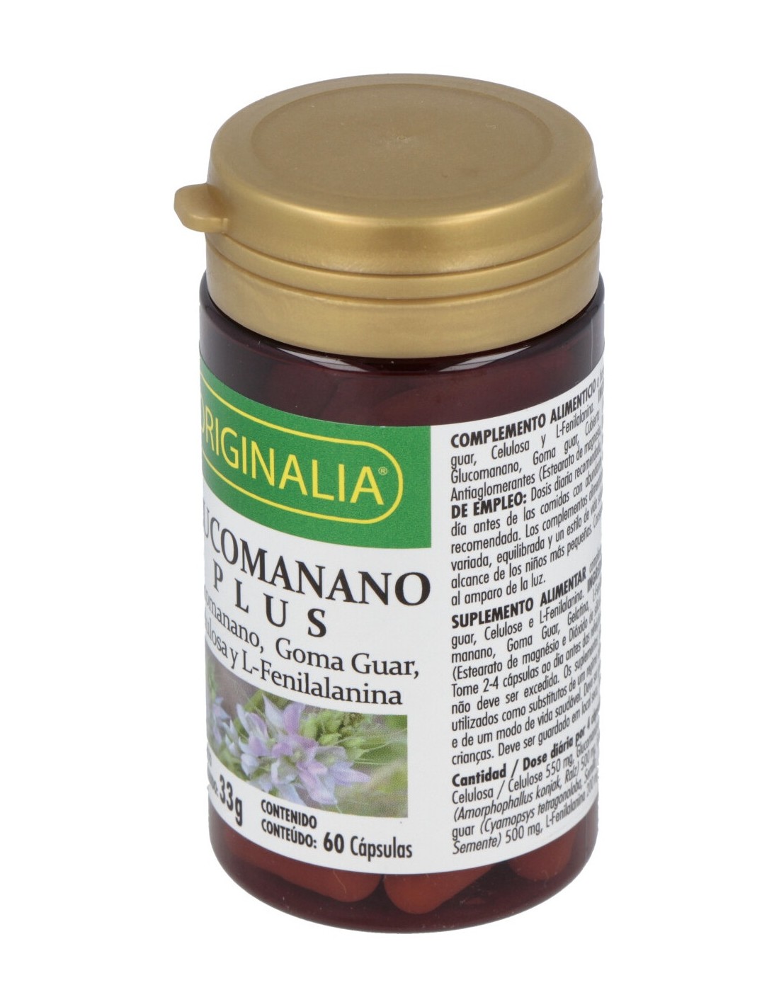 Complemento alimenticio que ayuda a conseguir un efecto saciante e ideal para dietas de adelgazamiento. Indicado para personas con un gran apetito o problemas para sentir saciedad. Elaborado a base de Konjac (Glucomanano) y otras fibras para conseguir un efecto saciante. Ayuda en el control de peso ya que el glucomanano como fibra natural absorbe agua, aportando sensación de saciedad, mayor volumen de las heces, por tanto puede mejorar el estreñimiento, siempre bebiendo abundante agua, ayuda a controlar la glucosa y colesterol, ya que retrasa el vaciado gástrico y absorbe grasas. También contribuye en otros beneficios como fibra dietética y natural.
