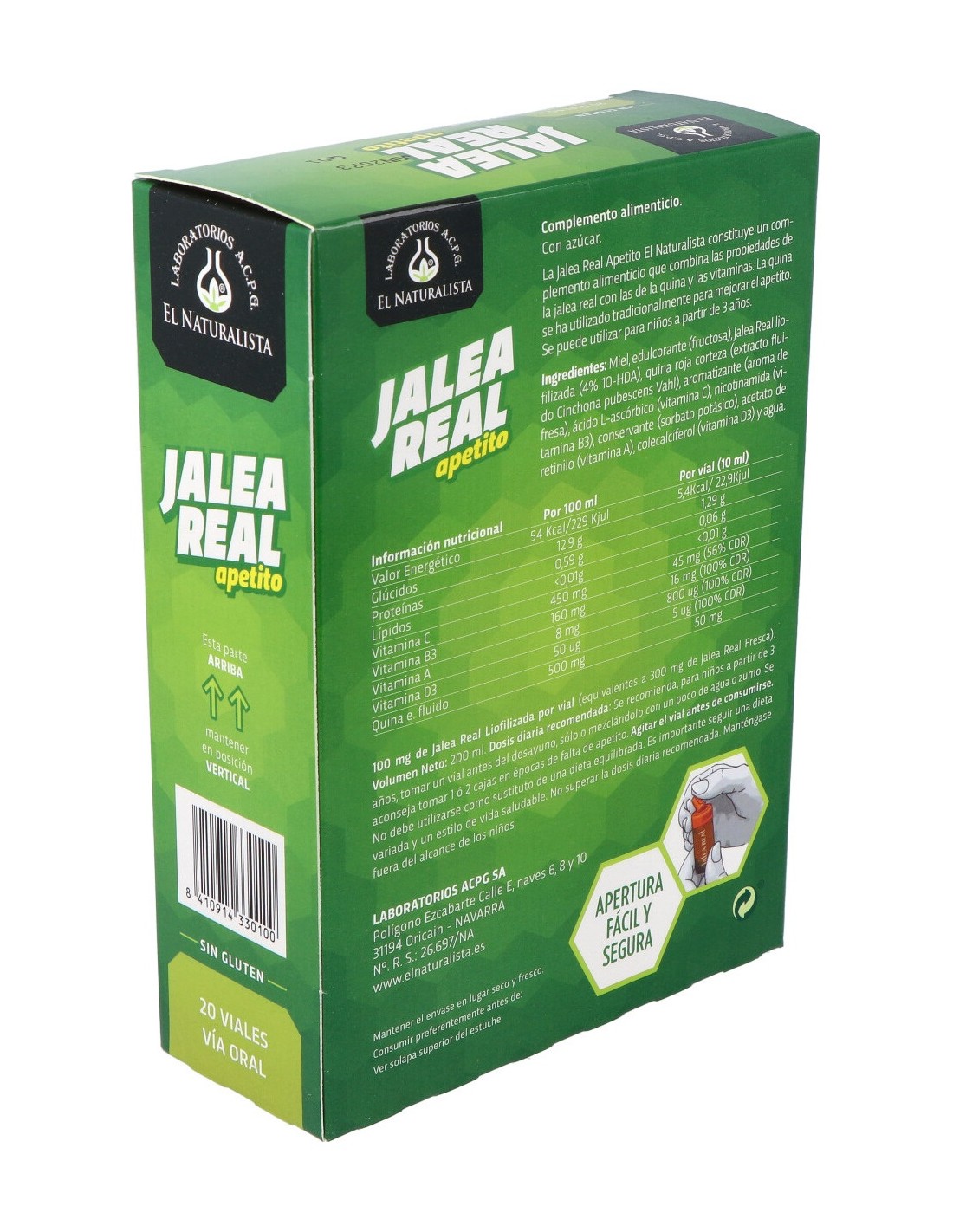 El Naturalista Jalea apetito con quina 20 viales es un complemento alimenticio con jalea real presentado en viales que ofrece al organismo las vitaminas, los minerales y la energía necesaria para afrontar el día a día.