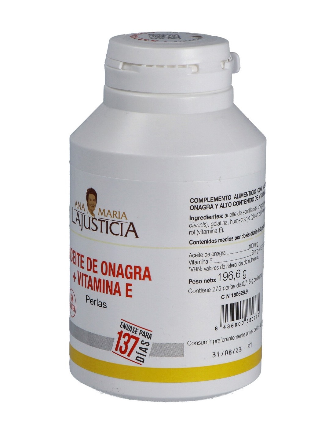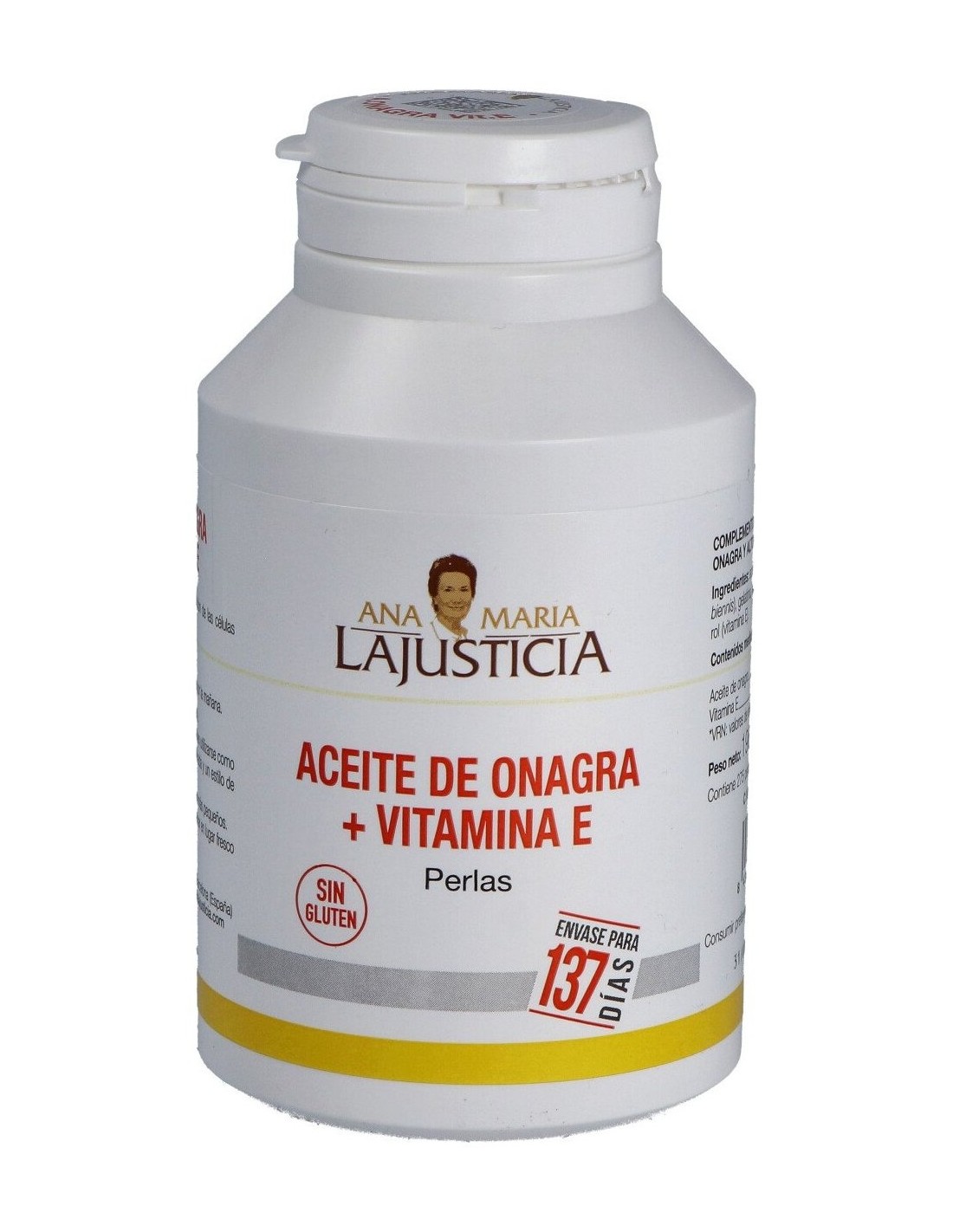 "Ana Maria Lajusticia Aceite De Onagra + Vitamina E 275 Perlas es un complemento alimenticio rico en vitamina E y ácidos grasos poliinsaturados, con aceite de Onagra. La vitamina E colabora con la protección de las células frente al daño oxidativo.