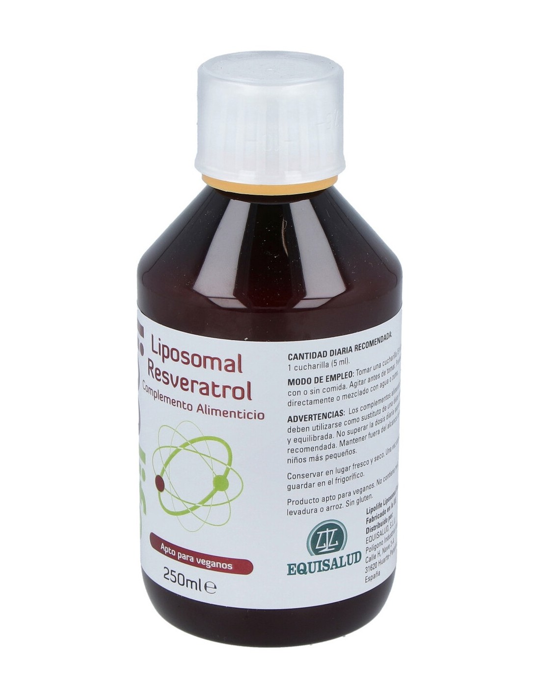 Ingredientes por 5 ml: agua purificada, emulgente (lecitina de girasol orgánica), etanol, conservante (sorbato potásico), resveratrol (Polygonum cuspidatum Sieb. Et Zucc.), 200 mg; humectante (glicerol), antioxidante (vitamina E como D-alfa-tocoferol).