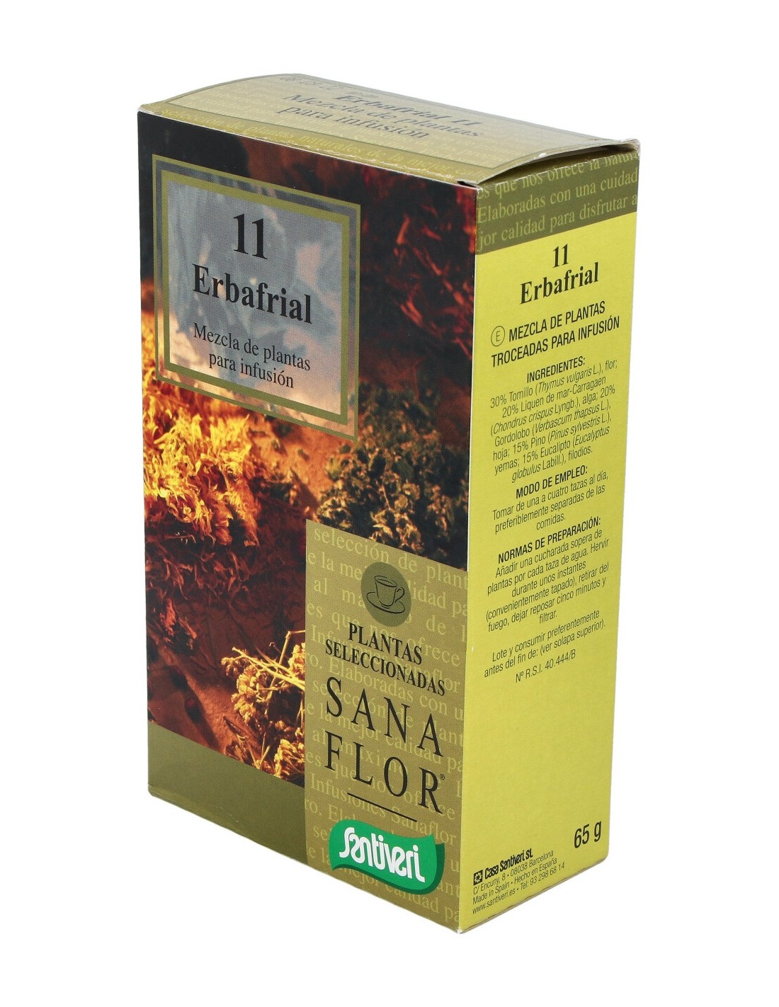 30% tomillo (Thymus vulgaris L. - sumidad), 20% equinácea (Echicacea purpurea Moench. - raíz), 20% líquen de mar - carragaen (Chondrus crispus L. - talo), 15% eucalipto (Eucalyptus globulus Labill. - hojas), 15% Melisa (Melissa officinalis L. - hojas).