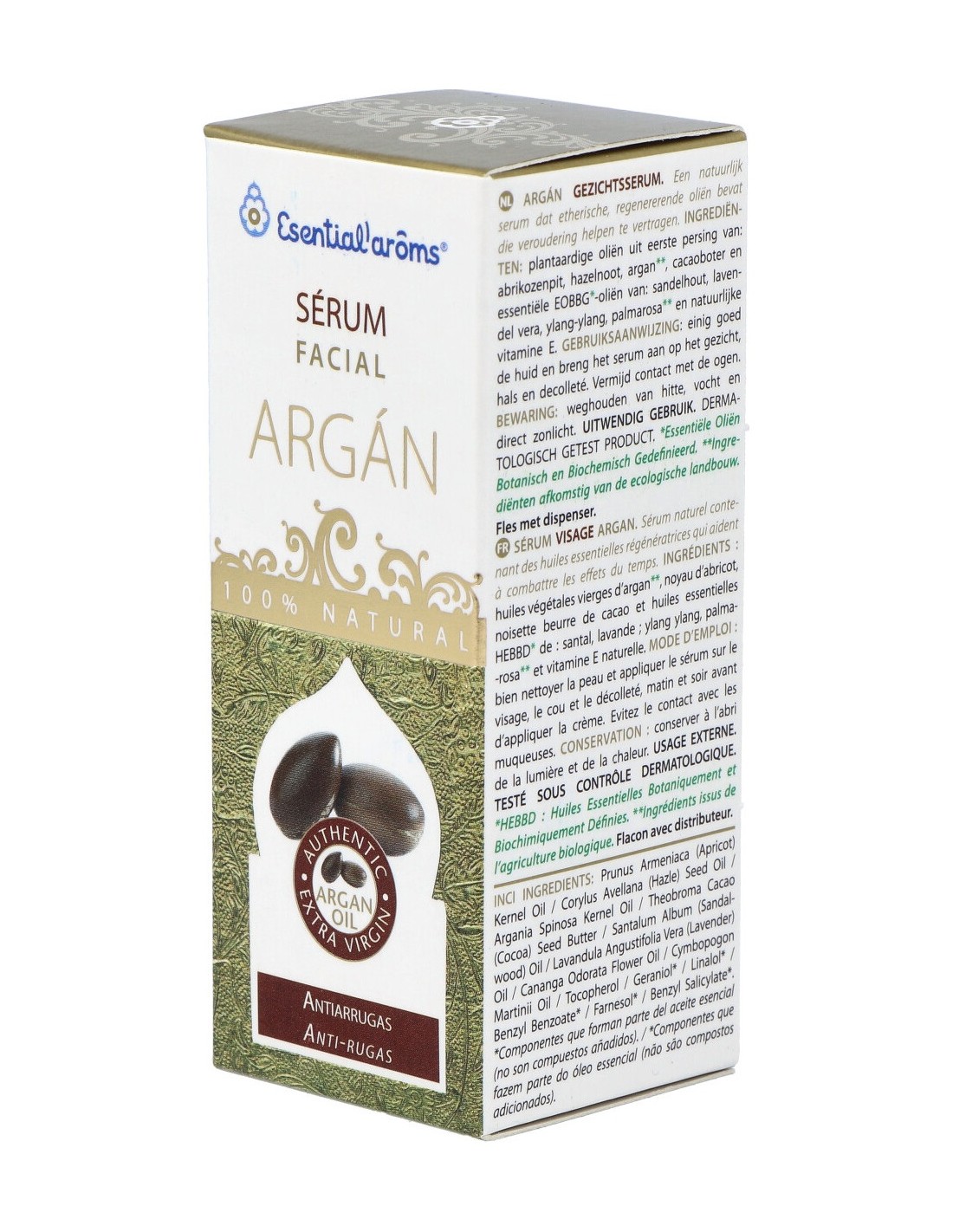 Sérum facial 100% natural elaborado a base de aceites esenciales y aceites vegetales vírgenes de una primera presión en frío, en el que su principal ingrediente es el aceite de argán. Con propiedades regeneradoras, reafirmantes e hidratantes, está indicado para usar como tratamiento intensivo en pieles apagadas, sin brillo, ofreciendo una piel tersa y firme donde se reducen visiblemente las pequeñas arrugas.