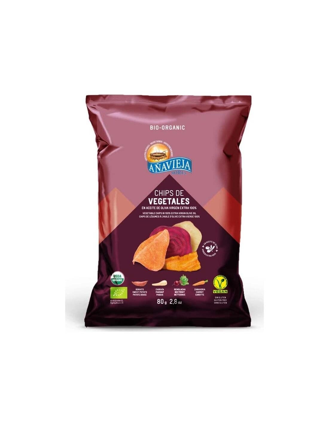 Chips de vegetales con aceite de oliva virgen extra 100% orgánico. Contribuyen a reducir el apetito entre las comidas, favoreciendo el aumento de la energía corporal. Además, son fuentes naturales de vitaminas y minerales que ayudan a contrarrestar la sensación de fatiga y/o cansancio. Contienen boniato, chirivía, remolacha y zanahoria procedentes de la agricultura ecológica. Cuentan con una textura crujiente y un sabor natural para consumir como snack salado. Sin azúcares ni conservantes. Aptas para veganos.
