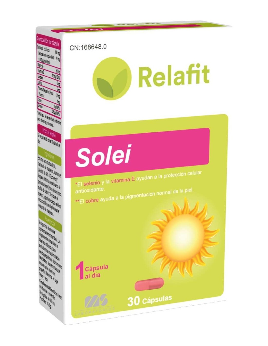 Talco 198 mg Gelatina 100 mg Extracto seco de tomate 60 mg Betacaroteno (extracto de dunaliella 20 mg, equivalente a 800 mcg de retinol), Vitamina E 10 mg Licopeno 6 mg Luteína (extracto vegetal rico en luteína) 5 mg Selenio 50 mcg