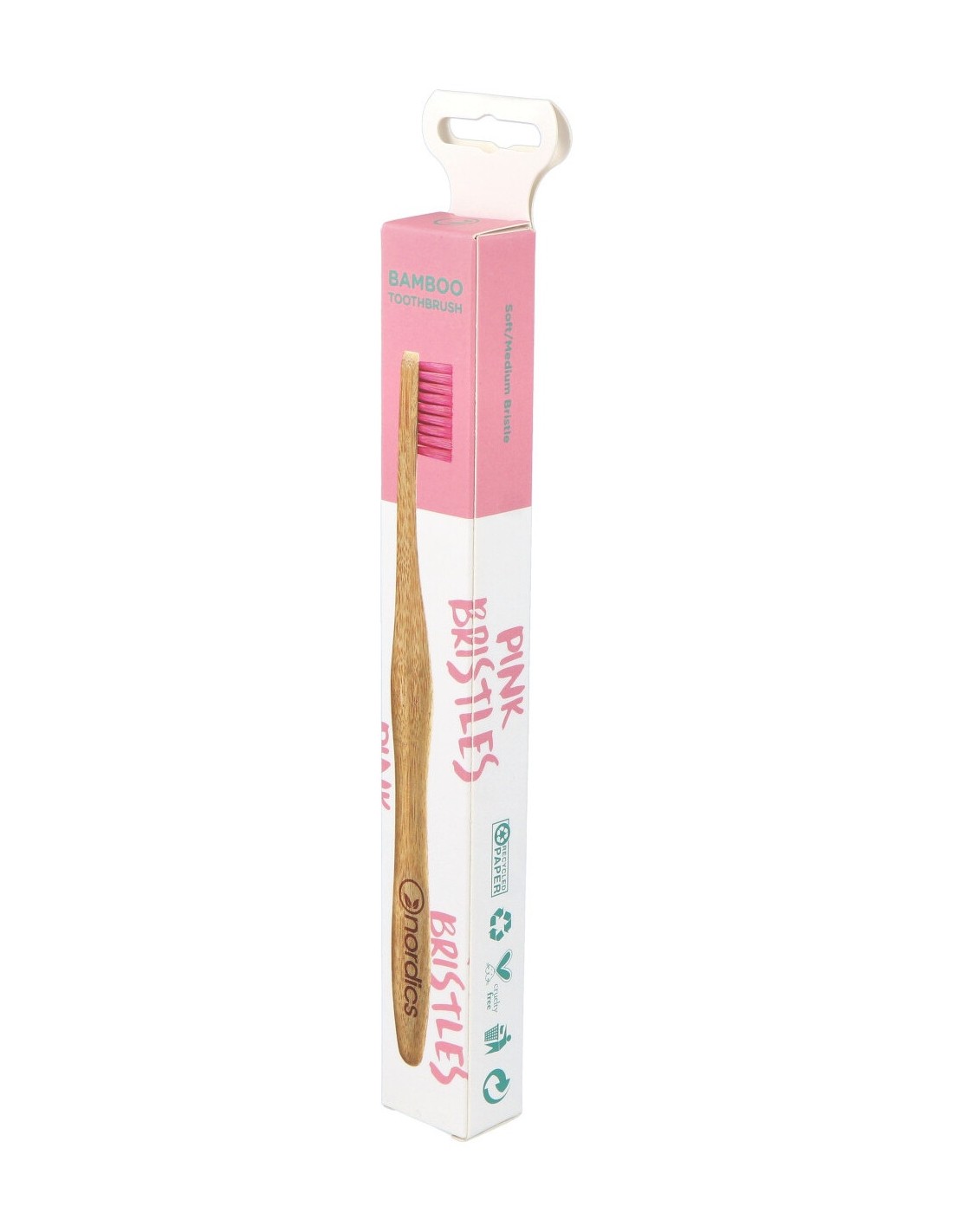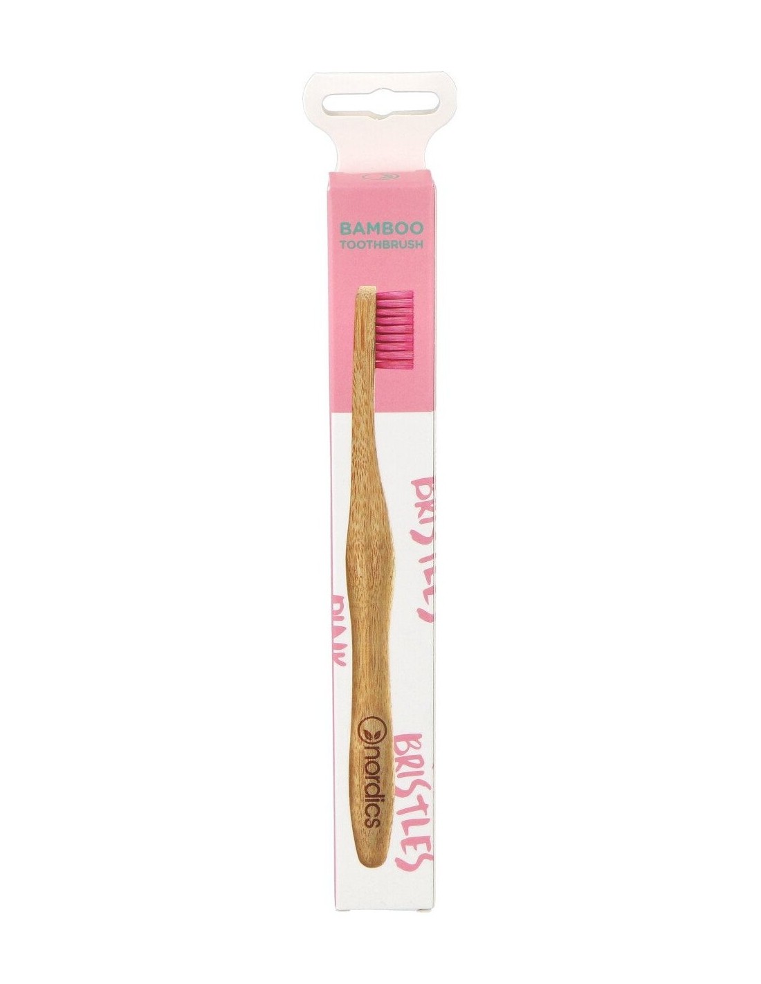 Cepillo dental con mango 100% de bambú moso, biodegradable. Con cerdas de nylon reciclado que limpian delicadamente los espacios interdentales sin dañar el esmalte. Presentado en un estuche de papel reciclado. Apto para veganos.