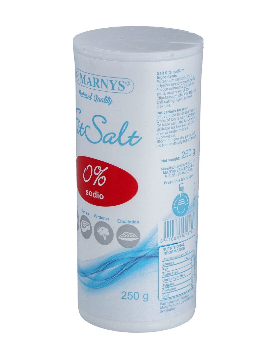 Condimento que sustituye la sal corriente por cloruro potásico. Favorece la disminución de la ingesta de sodio y de los efectos de éste en la presión arterial, permitiendo el disfrute de las comidas condimentadas saludablemente. Recomendada para personas con dietas especiales o que quieran sustituir la sal por otra alternativa saludable.