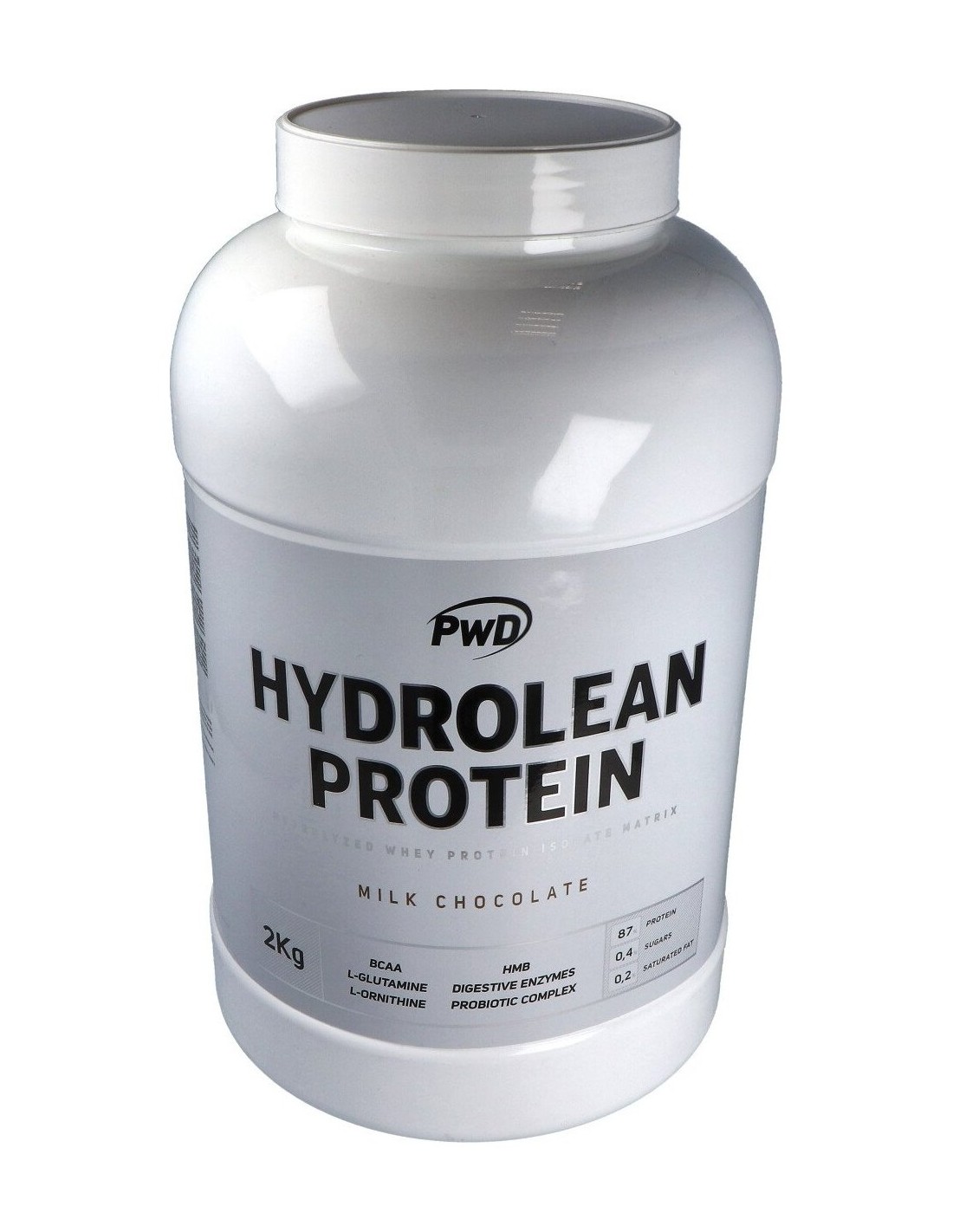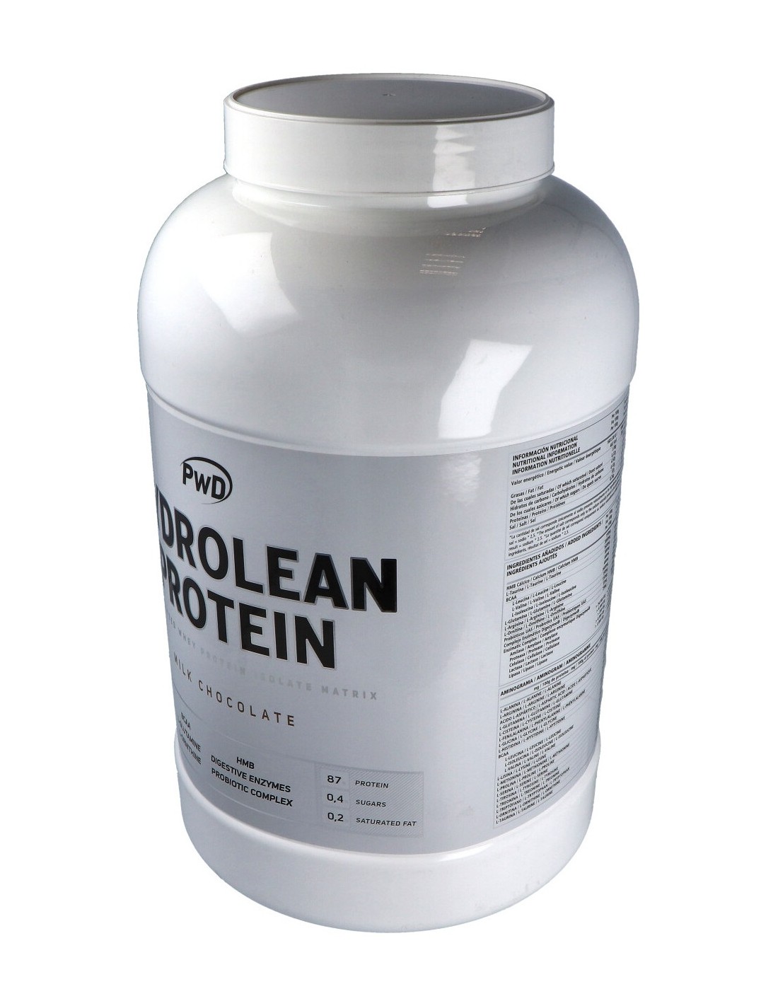 Mezcla proteica (aislado de proteína de suero hidrolizada (emulgente: lecitina de soja)), concentrado de proteína de suero (emulgente: lecitina de soja)), proteína de leche MPI (Milk Protein Isolate) 90% (emulgente:lecitina de soja), leche en polvo descremada), Cacao en polvo, L-Taurina, BCAA 2:1:1, L-Glutamina, Aroma (Aroma de chocolate), Isomaltulosa (Palatinose TM)*, Fructosa, Maltodextrina, Edulcorante (sucralosa), L-Arginina, L-Ornitina, HMB Cálcico (ß-Hidroximetilbutirato de calcio), Mezcla de Probióticos UAS (Lactobacillus acidophilus, Bifidobacterium longum, Bifidobacterium bifidum, Bifidobacterium lactis, Fructooligosacáridos, antiaglomerante (estearato de magnesio) y maltodextrina de arroz), Complejo Enzimático Digezyme® (Maltodextrina, Amilasa, Celulasa, Lactasa, Lipasa y Proteasa).