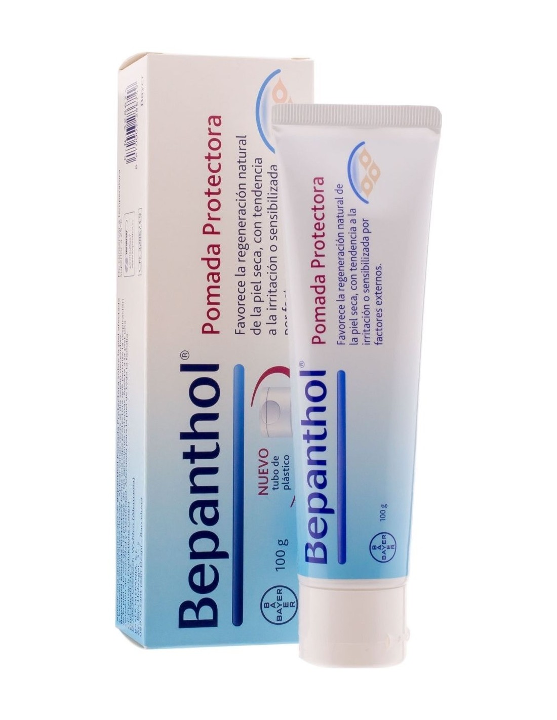 Bepanthol® Pomada Protectora 100g es una emulsión oleosa hidratante y protectora, que favorece la regeneración natural de la piel seca, sensible y fácilmente irritable. Su fórmula tiene un alto contenido lipídico y en dexapantenol, que forma una capa protectora sobre la superficie de la piel, que la aísla de los agentes externos que la irritan.