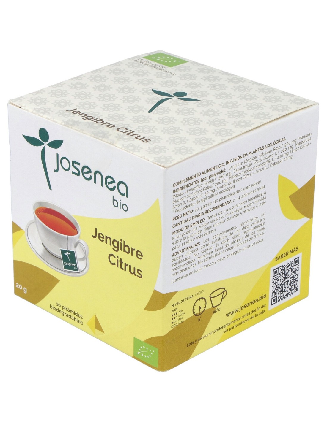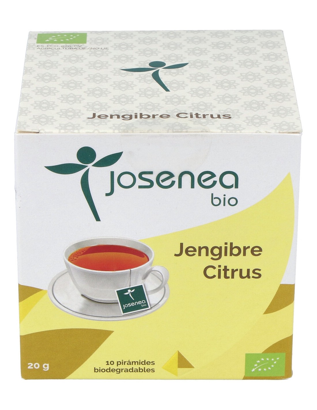 Josenea Jengibre citrus BIO caja 10 pir es una mezcla que combina el picor del jengibre, el ácido del limón y la dulzura de la manzana proporcionando un agradable sabor a tu paladar.