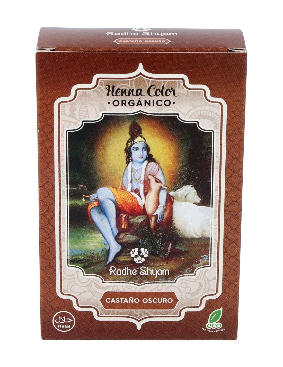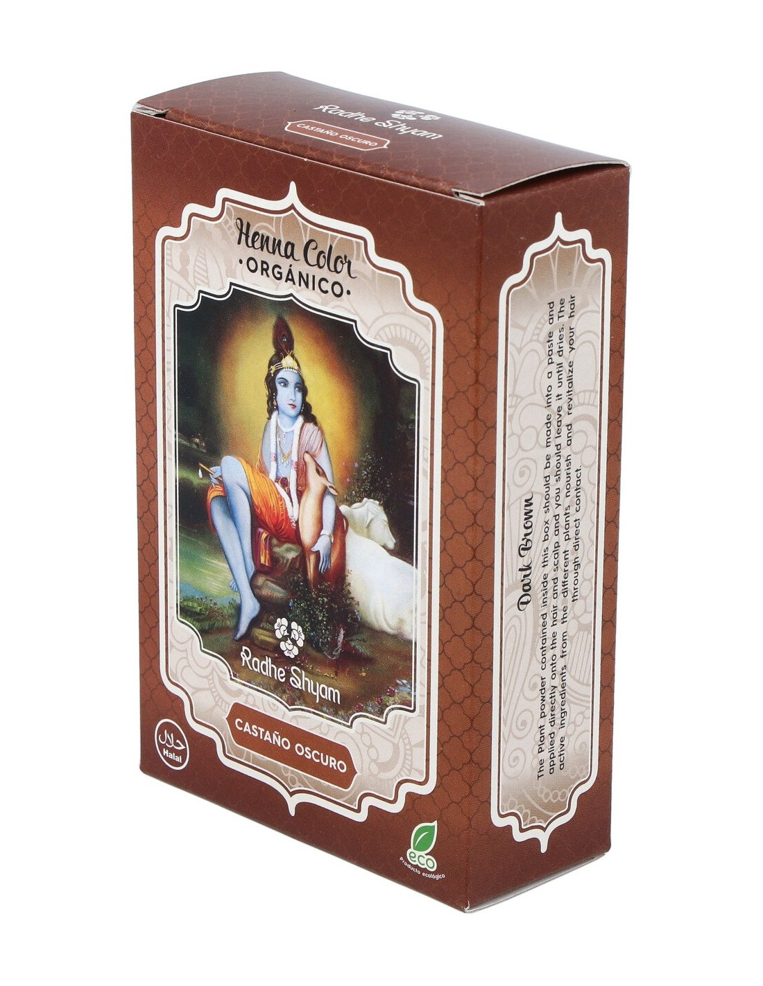 Tinte Natural para el pelo a base de plantas, que cuida y nutre la piel, del que se obtiene un color marrón oscuro.HENNA POLVO CASTAÑO OSCURO 100gr. de RADHE SHYAM