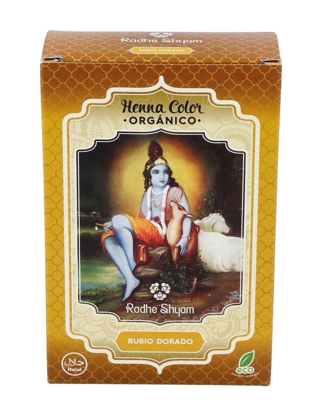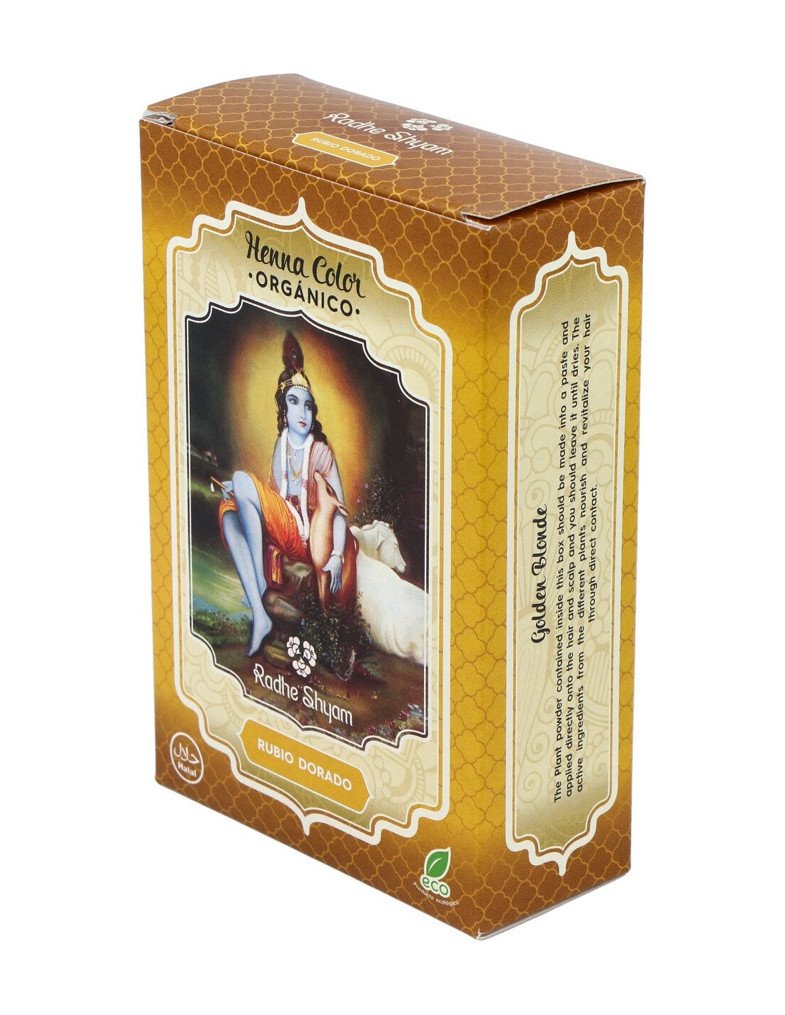 Tinte Natural para el pelo a base de plantas, que cuida y nutre la piel, del que se obtiene un color rubio vivo. Apto para veganos. Sin amoniaco, PPD, ni sales metálicas.HENNA POLVO RUBIO DORADO 100gr. de RADHE SHYAM