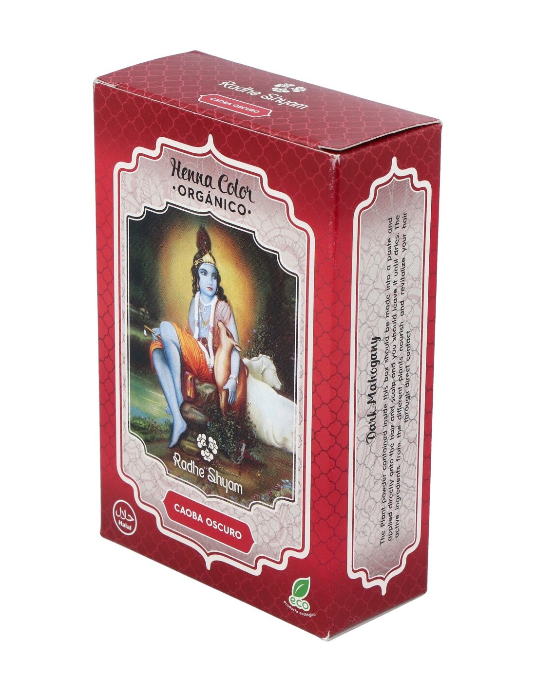 Tinte Natural para el pelo a base de plantas, que cuida y nutre la piel, del que se obtiene un color rojizo oscuro. Apto para veganos. Sin amoniaco, ni PPD.HENNA POLVO CAOBA OSCURO 100gr. de RADHE SHYAM