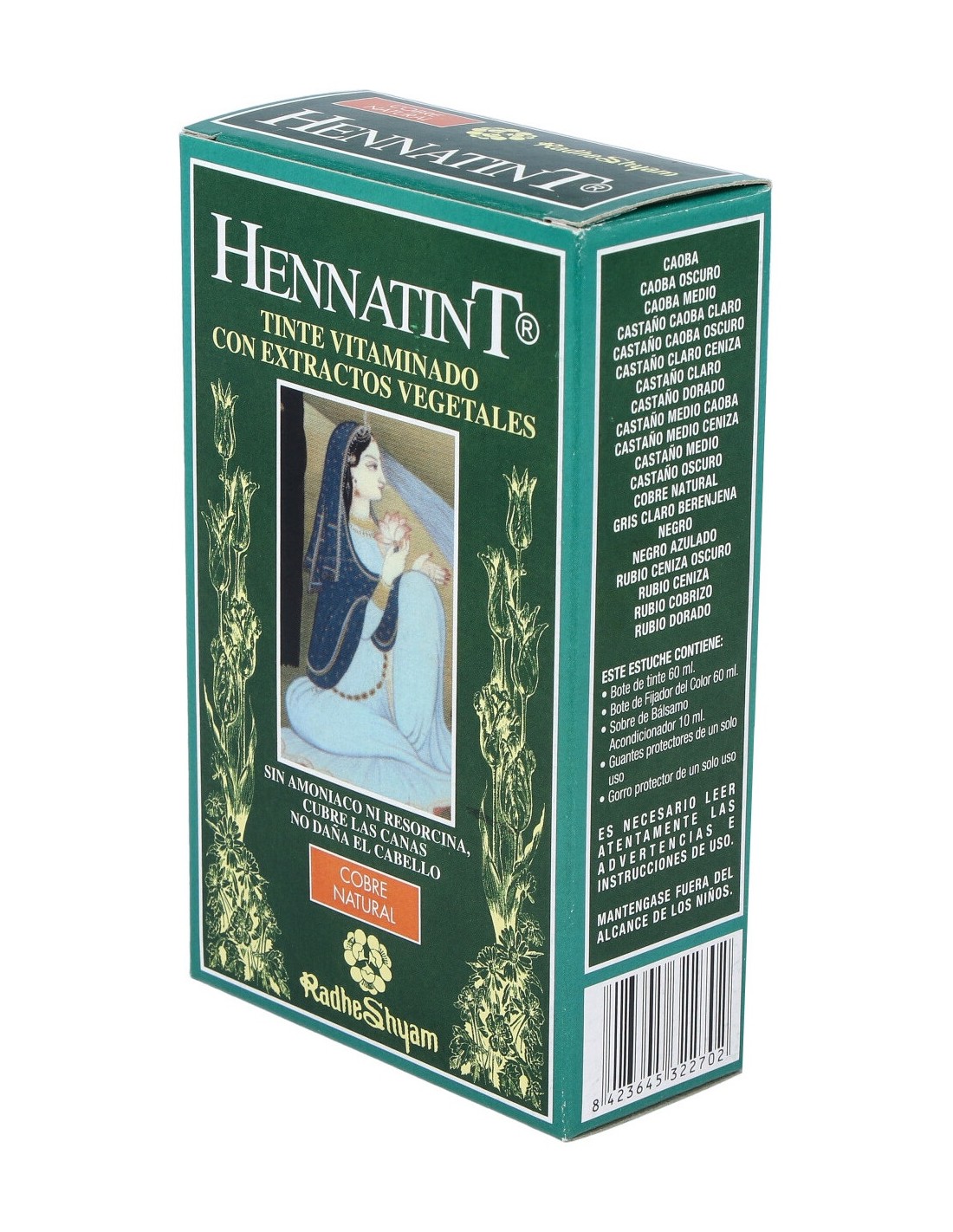 Tinte semipermanente sin amoniaco que cubre las canas desde la primera aplicación. Da al pelo una coloración y un brillo natural.HENNATINT COBRE NATURAL 60ml. de RADHE SHYAM