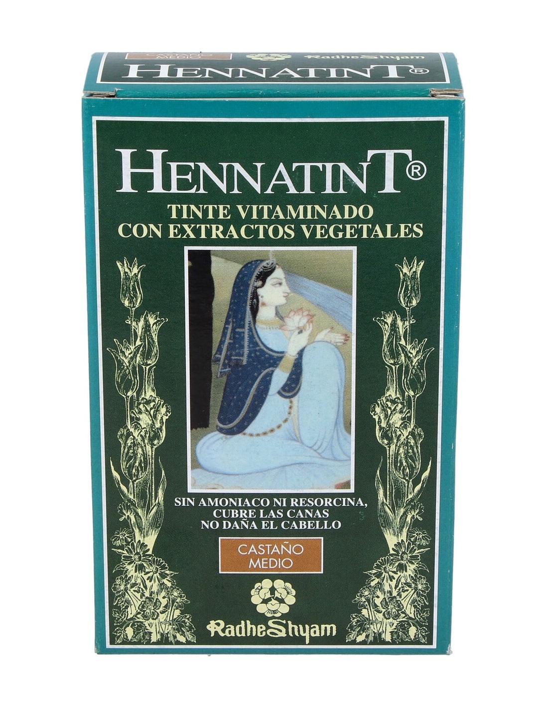 Tinte semipermanente sin amoniaco que cubre las canas desde la primera aplicación. Da al pelo una coloración y un brillo natural.HENNATINT CASTAÑO MEDIO 60ml. de RADHE SHYAM
