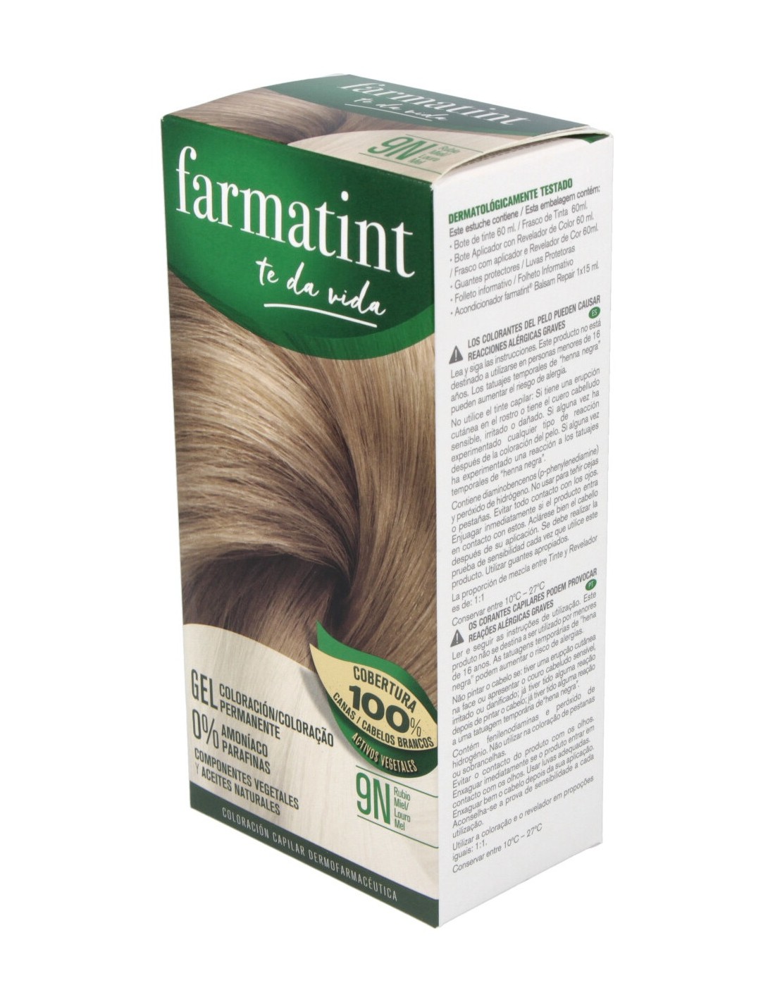 Pese a que Farmatint no contiene Metales Pesados, siempre es aconsejable realizar el Test de Generalidad que se describe en el folleto informativo, especialmente en el caso de personas que tienen alergia. El Tinte Farmatint 9N Rubio Miel aportará un color duradero y brillante a tu pelo, sin riesgo de dañarlo al contener sólo ingredientes vegetales, no perjudiciales para el cabello.