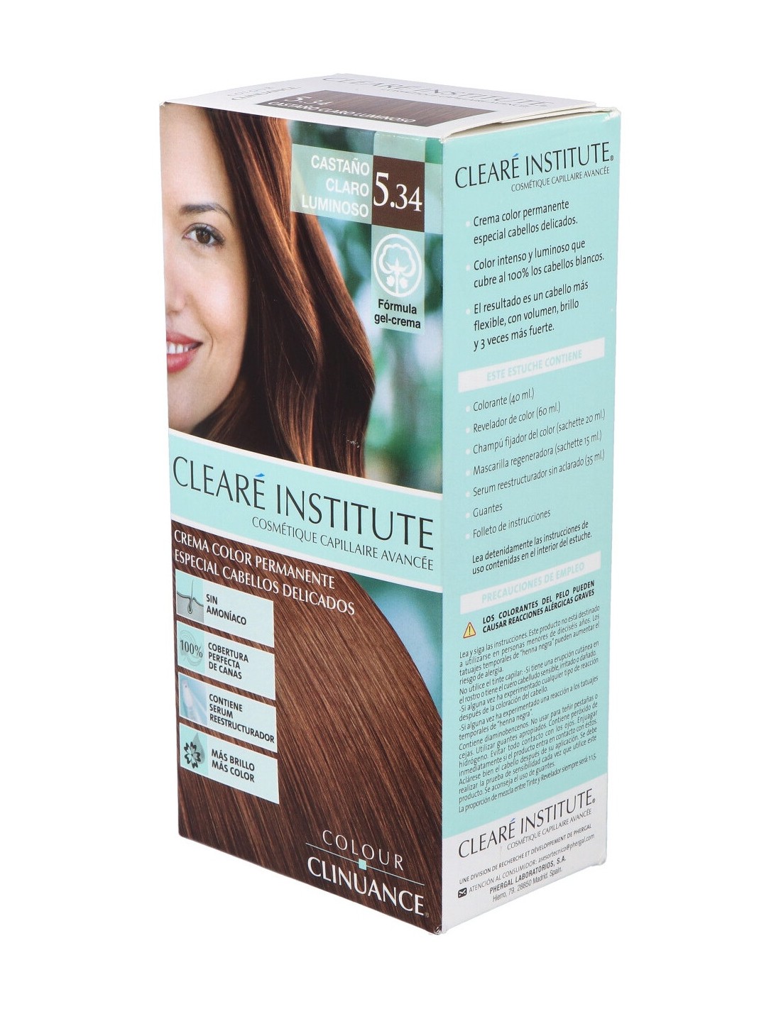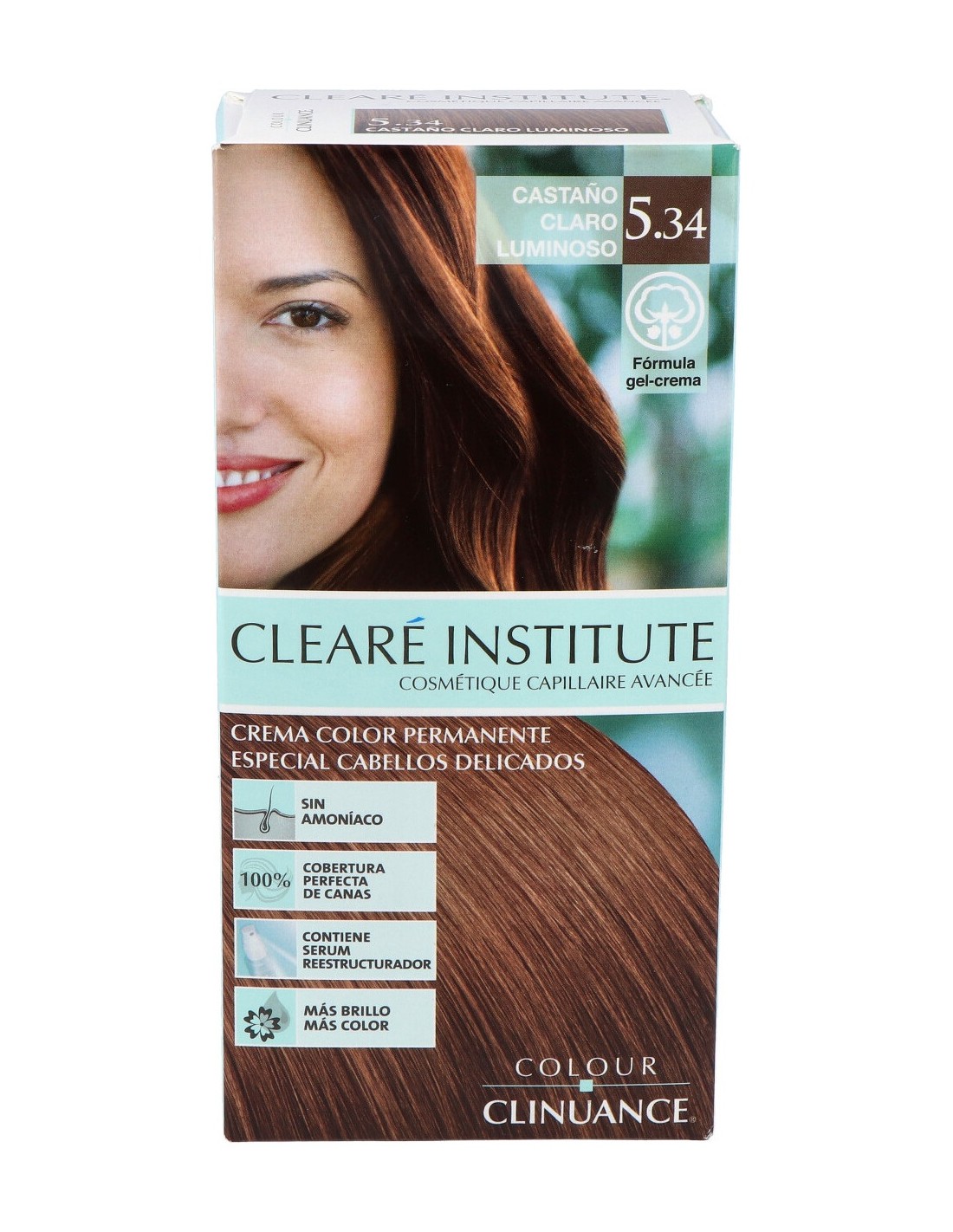 Cosmética capilar farmacéutica fabricada con ingredientes de origen natural. Ayuda a conseguir un cuero cabelludo más sano y una fibra capilar fortalecida gracias a los los extractos vegetales orgánicos y una fórmula libre de parabenos, aceites minerales y siliconas.COLOUR CLINUANCE 5.34 castaño claro luminoso delic de CLEARE INSTITUTE