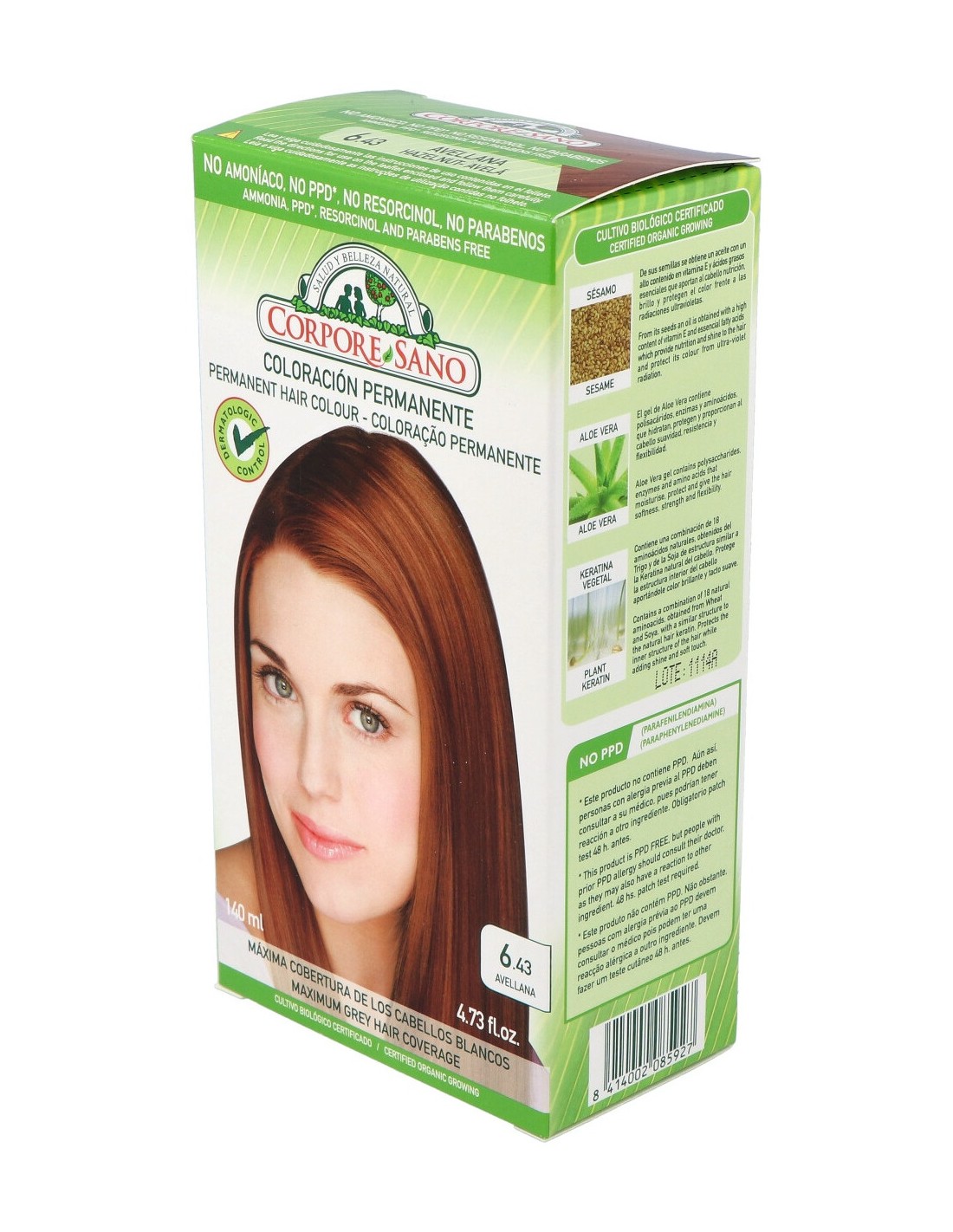 Tinte Avellana (6.43) que gracias a esta nueva línea se consigue máxima cobertura, color intenso y radiante, larga duración, protección del color y máximo cuidado. La nueva línea de tintes permanentes son la auténtica revolución. Su innovadora fórmula proporciona la máxima coloración y protección al cabello, aportándole brillo y suavidad y facilitando el equilibrio natural del cuero cabelludo. Su fórmula está enriquecida con ingredientes naturales que facilitan una protección natural del cabello y del cuero cabelludo.