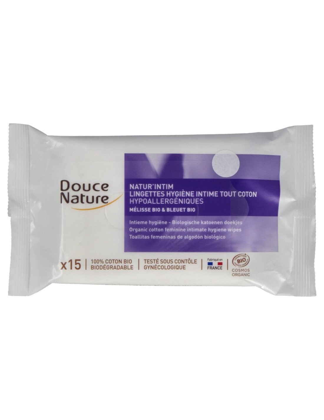 Toallitas para la higiene íntima de 100% algodón bio. Con extracto de melisa y agua floral. Para uso externo. Sin jabón, sin alcohol, sin parabenos ni perfumes sintéticos. Hipoalergénicas, formuladas y probadas para minimizar el riesgo de alergias.