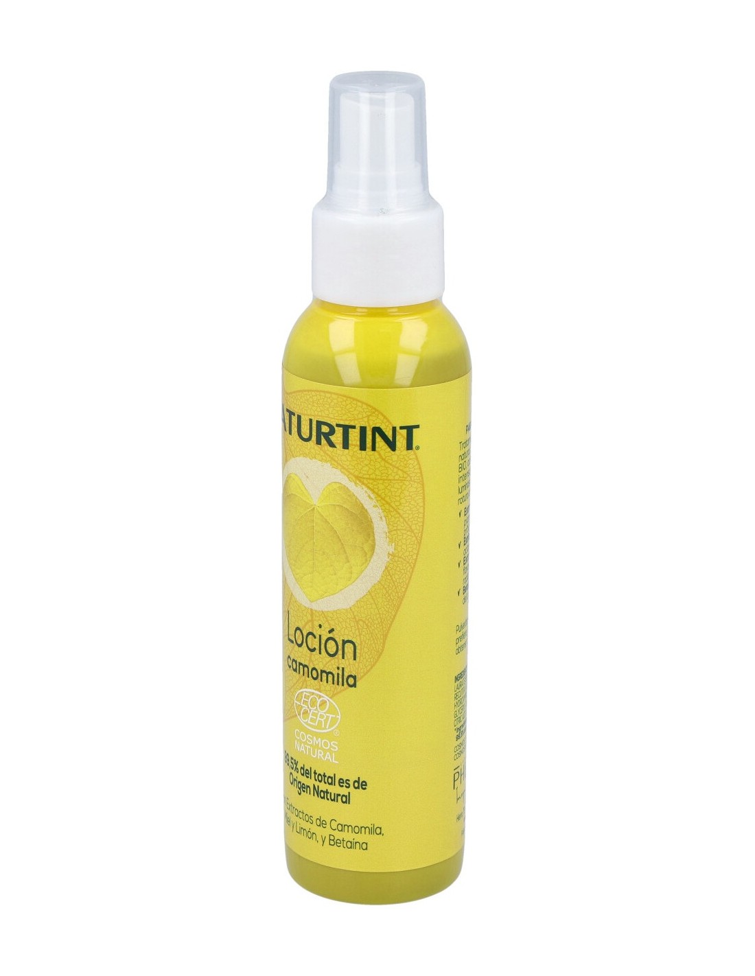 Loción capilar de camomila en práctico formato pulverizador, formulado con un 98,9% de ingredientes de origen ecológico, idóneo para cabellos que buscan potenciar reflejos dorados y un aclarado progresivo de forma natural. Gracias a sus principios activos como el de la camomila, que aporta un pigmento amarillo natural al pelo, la miel, que favorece al aclarado del pelo y potencia los reflejos, el limón, que ofrece luminosidad y protección al cabello frente los rayos UV, y la betaína, que aumenta su fortaleza y flexibilidad, el cabello queda más fuerte y con un aspecto brillante.
