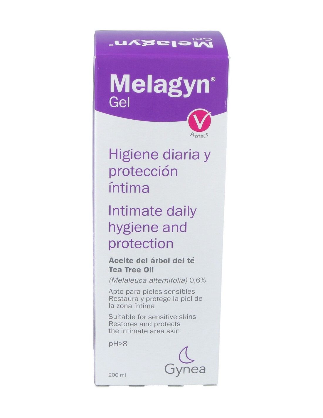 Melagyn® Gel 200ml es un gel de higiene íntima formulado con aceite de árbol de té (Melaleuca alternifolia) y un pH ligeramente alcalino superior a 8. Aporta propiedades antisépticas e inhibidoras del crecimiento de hongos y bacterias, así como calmantes del picor y escozor.