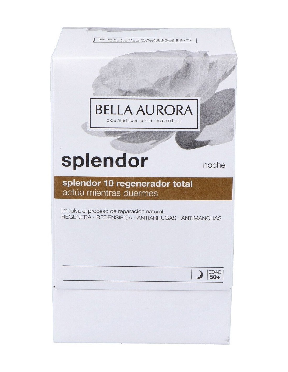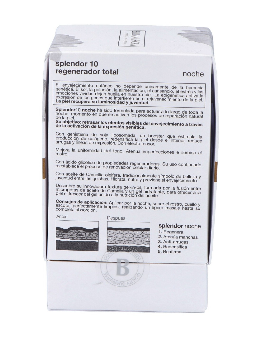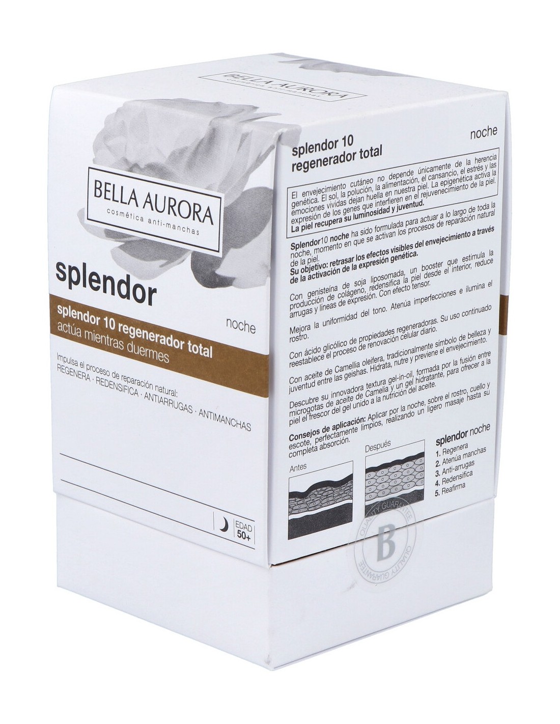 "Bella Aurora Splendor10 noche tratamiento antiedad 50ml es un producto de la gama de belleza Bella Aurora que ayuda a combatir los 10 signos de la edad en pieles maduras o mayores de 45 años. Su innovadora textura de """"gel en aceite"""" se funde con la piel y aporta una sensación de confort y bienestar. La crema Splendor 10 antiedad noche actúa durante la noche mientras duermes y aprovecha los procesos de regeneración natural de las células de la piel. De esta manera retrasa los 10 signos del envejecimiento a través de la epigenética. Su combinación de Genisteína de Soja Liposomada y Ácido Glicólico redensifica la piel, alisa las arrugas y restablece el proceso de renovación celular diario. Además, el Aceite de Camelia hidrata y nutre la dermis y deja un suave aroma en la piel.