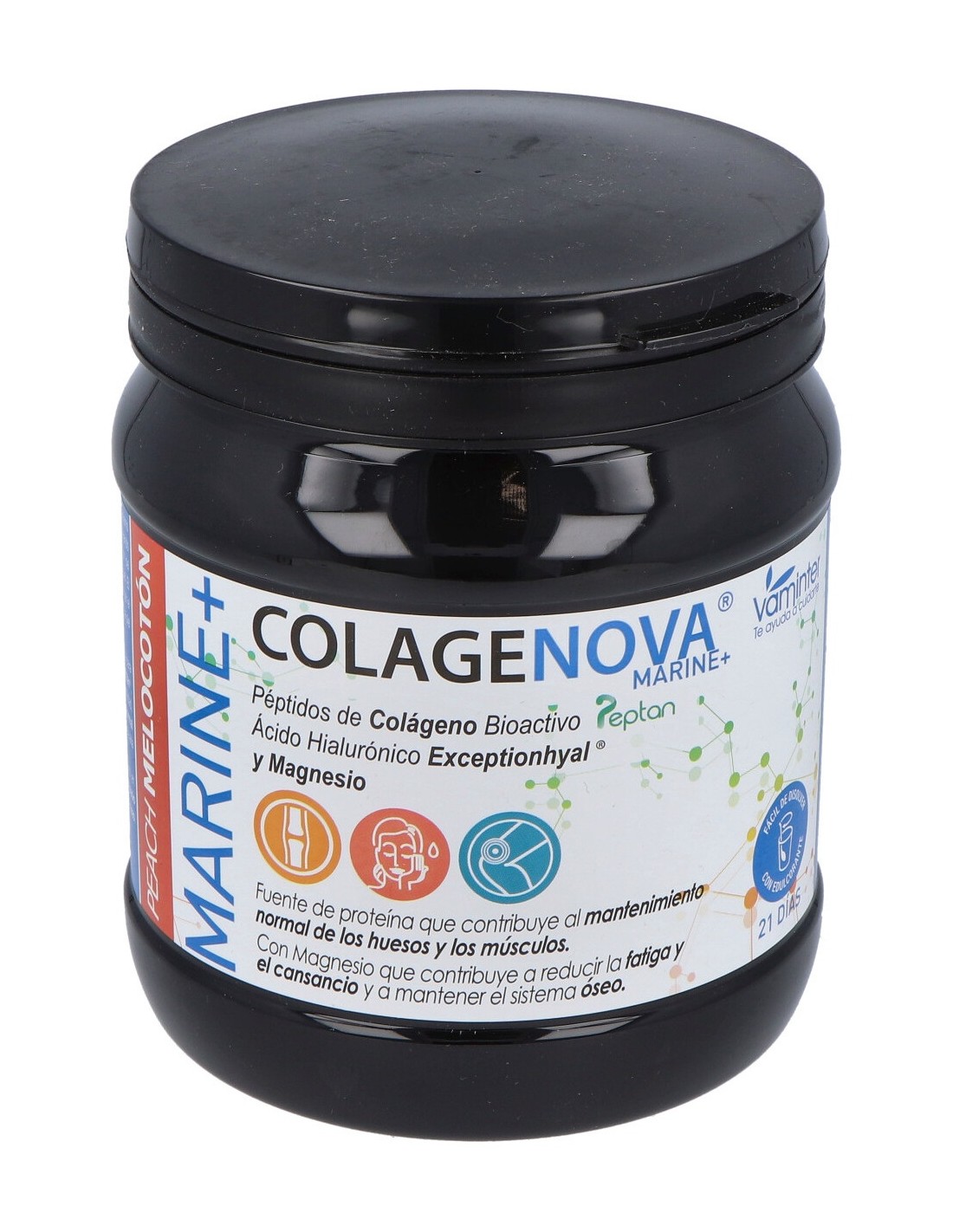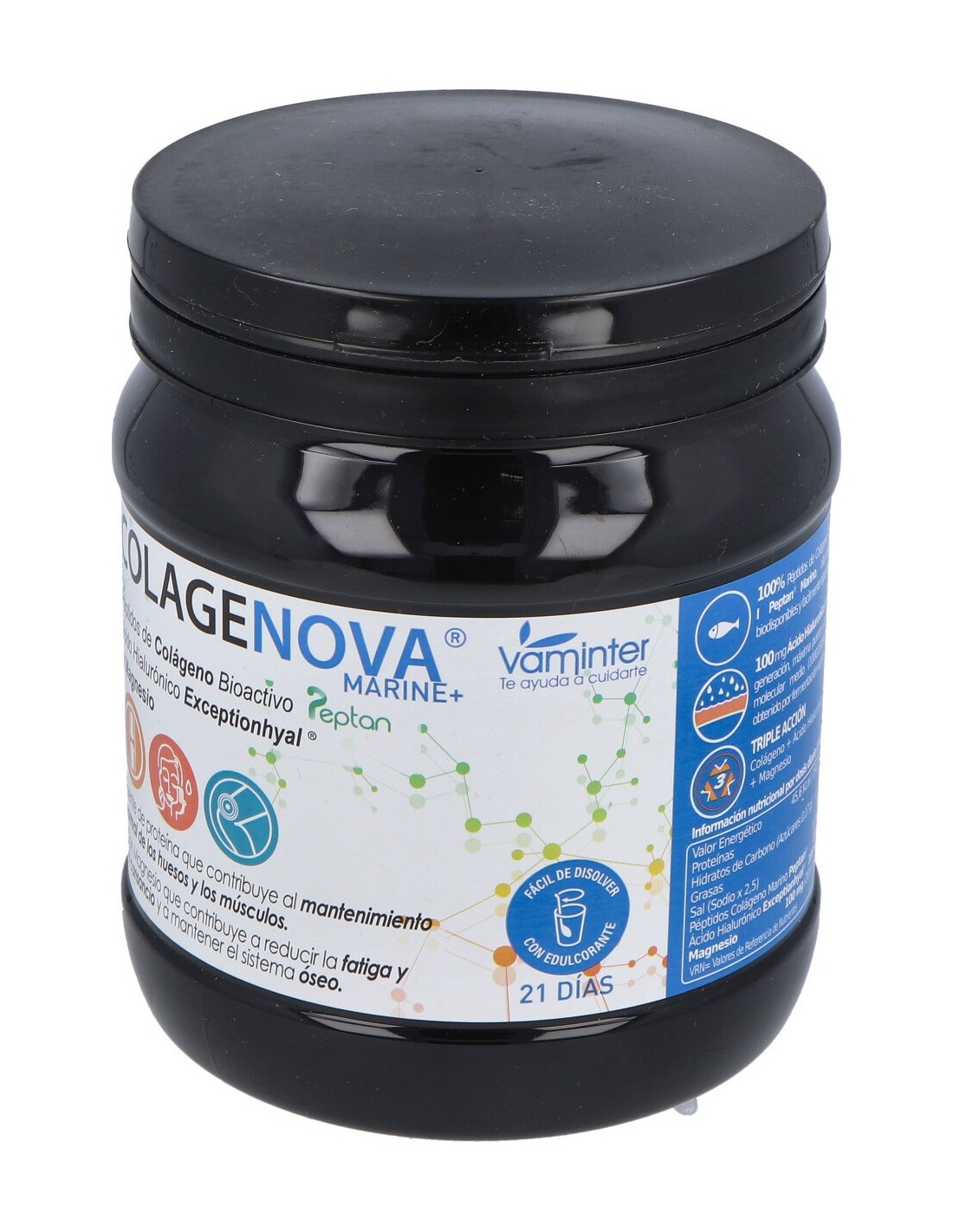 Complemento alimenticio a base de péptidos de colágeno hidrolizado puro procedentes de pescado con ácido hialurónico de origen vegetal y gluconato de Magnesio. Contribuye al mantenimiento del sistema óseo y muscular.