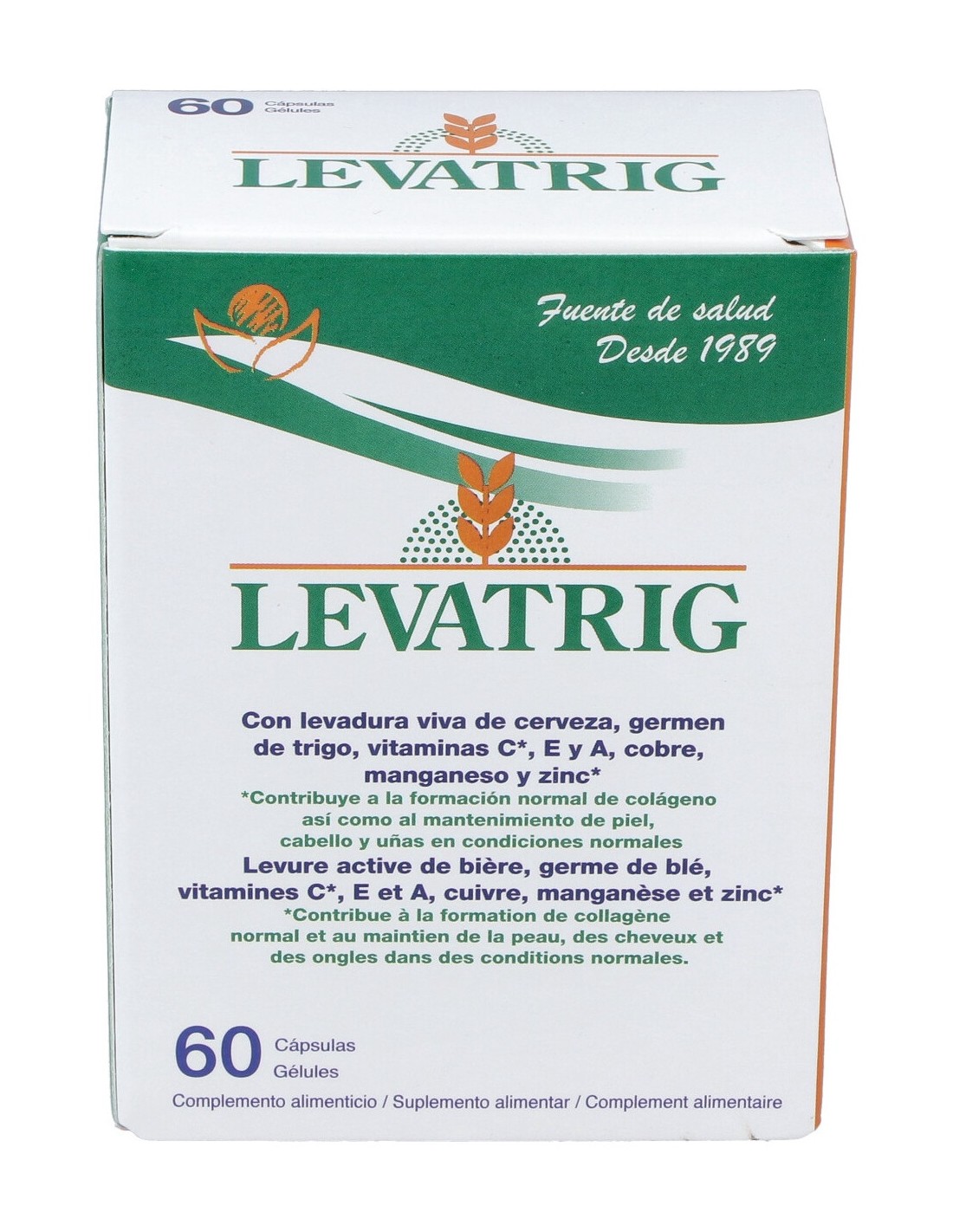 Herbetom Levatrig 60 cápsulas contiene levadura viva de cerveza, germen de trigo, vitaminas C, E y A, cobre, manganeso y zinc. Contribuye a la formación normal de colágeno, así como al mantenimiento de la piel, cabello y uñas en condiciones normales.