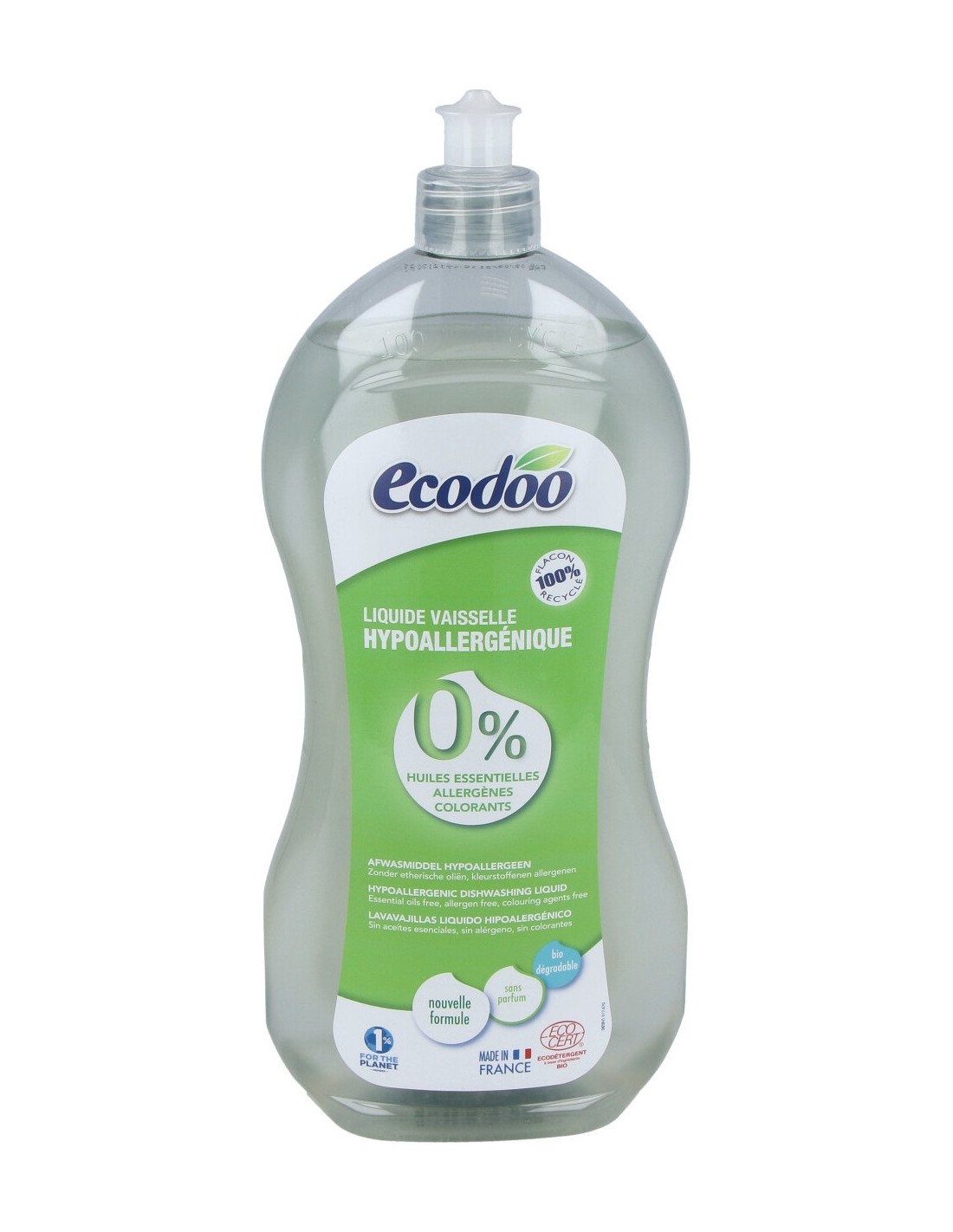 Lavavajillas líquido hipoalergénico para lavar a mano. 0% Aceites esenciales, 0% Colorantes. Sin perfume. Envase 100% biodegradable.