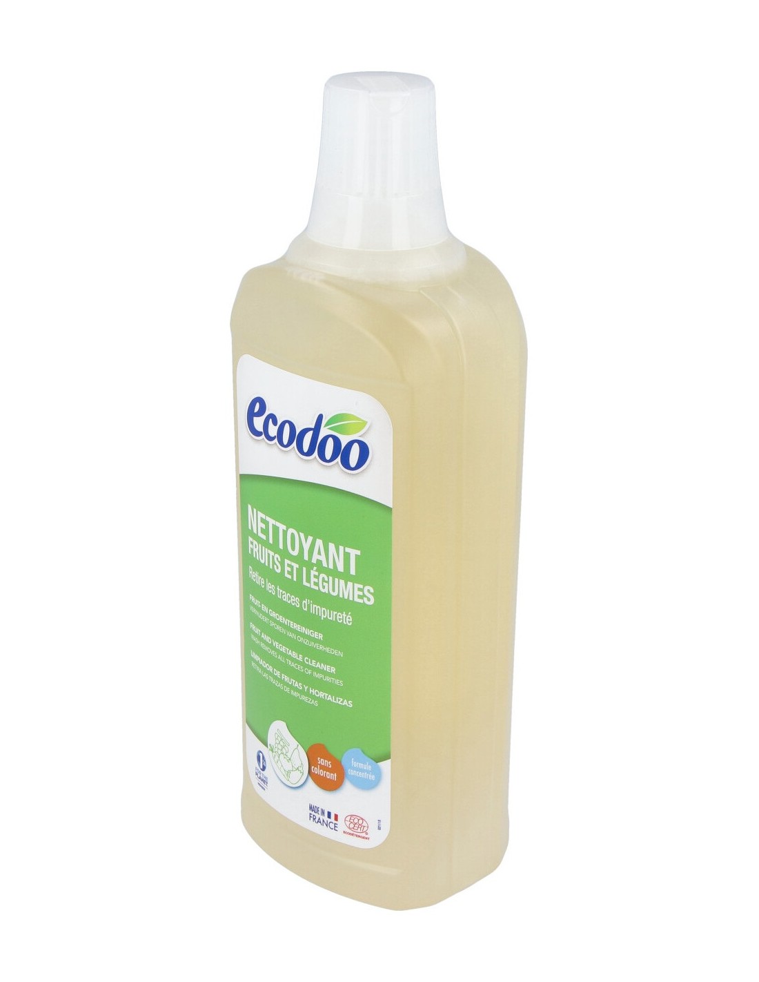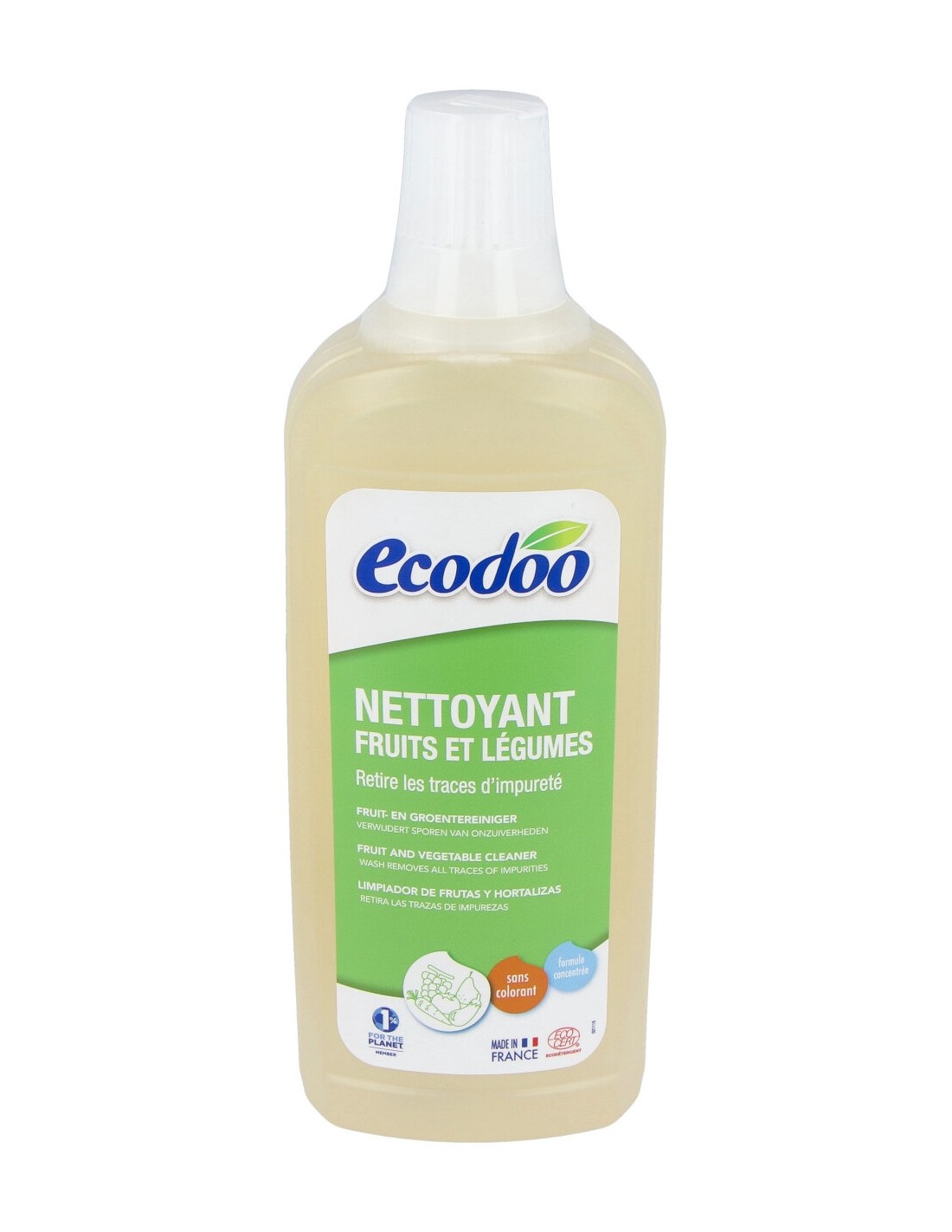 Para limpiar las frutas y verduras de una manera natural. Para utilizar directamente o diluido en agua. Elimina la tierra y las impurezas. Con tapón dosificador. Con aval ecodetergente ECOCERT. Certificado por ECOCERT Greenlife.