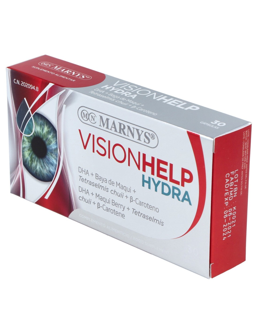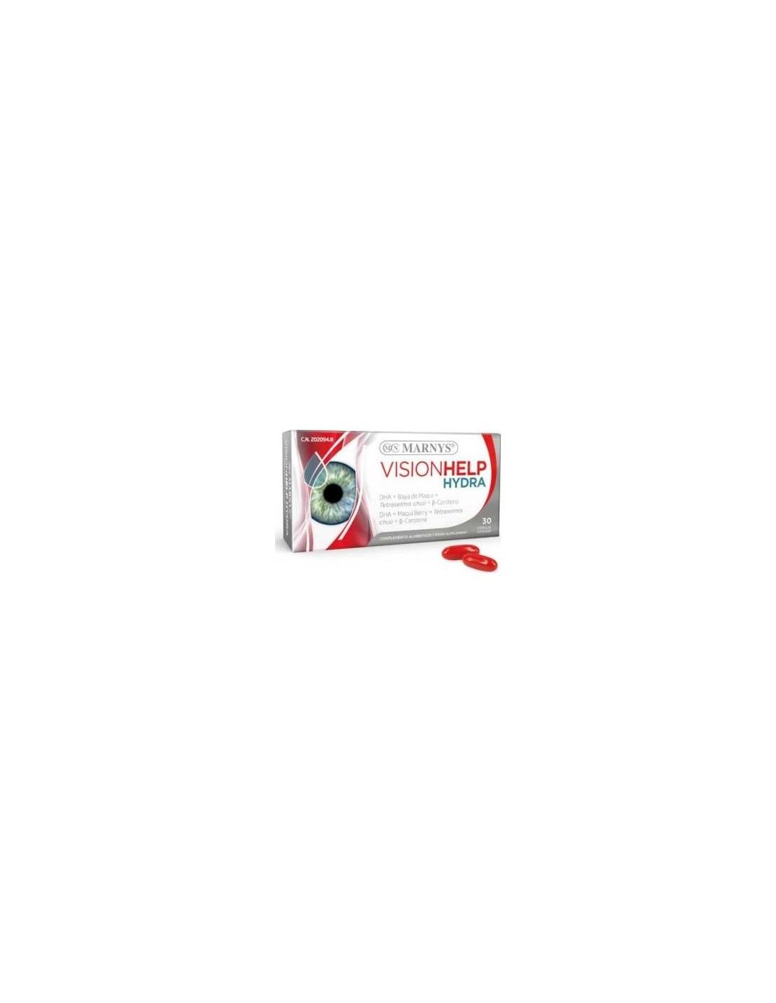 Complemento alimenticio en forma de cápsulas, elaborado a base de aceite de pescado rico en omega 3 (50%DHA y 12% EPA), extractos de baya maqui y de alga tetraselmis chuii, y betacarotenos, que favorece la hidratación profunda y constante de la mucosa del ojo.