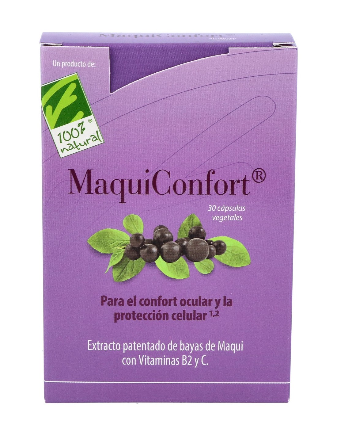 100% Natural MaquiConfort 30 cápsulas vegetales es un complemento alimenticio a base de extracto patentado de bayas de Maqui estandarizado en flavonoides enriquecido con vitaminas B2 y C que ayudan a proteger las células frente al daño oxidativo. Además también ayuda al adecuado mantenimiento de la visión y de las membranas mucosas.