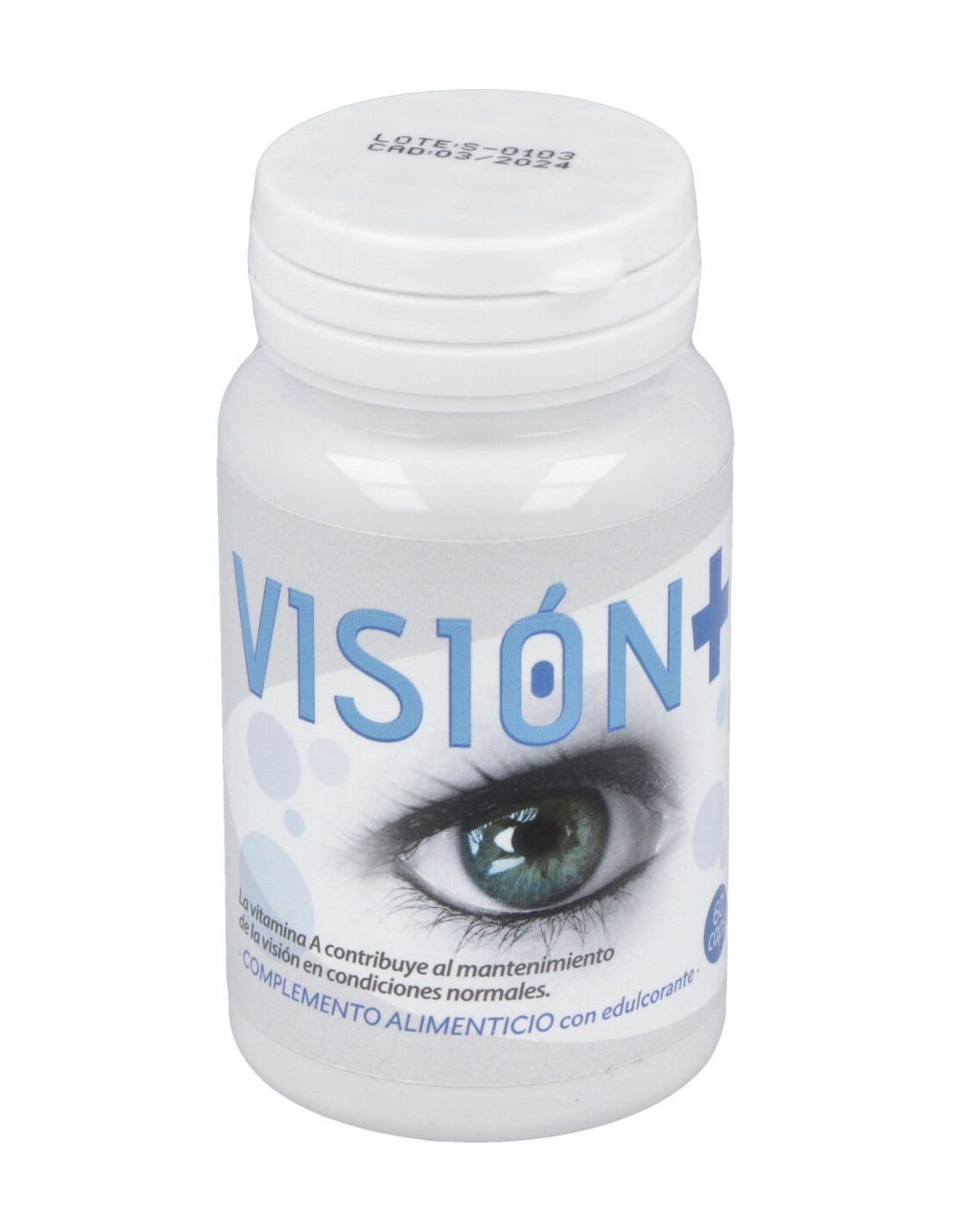 Complemento alimenticio en forma de cápsulas, elaborado a base de extractos secos de mirtilo, luteína, resveratrol, zeaxantina y vitaminas, que contribuye a aliviar la fatiga visual y mejorar la salud ocular.