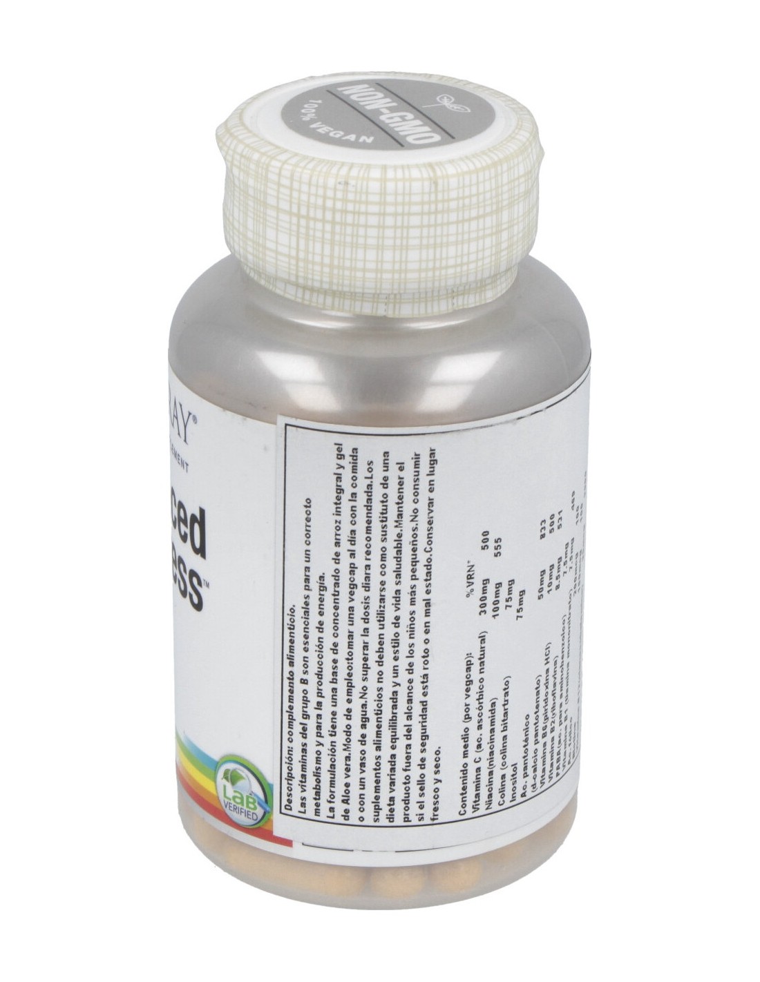 Vitamina C (ácido ascórbico natural), niacina ( niacinamida): cápsula de celulosa vegetal, colina (colina bitartrato), inositol, ácido pantoténico (d-calcio pantotenato), base de alimentos enteros(concentrado de arroz integral: incluyendo germen, salvado y ceras), gel de aloe vera, vitamina B6 (piridoxina HCI), PABA (ácido paraminobenzoico), vitamina B1(tiamina mononitrato): antiaglomerante: sílice y esterarato de magnesio, ácido fólico, biotina, vitamina B12 (cianocobalamina).