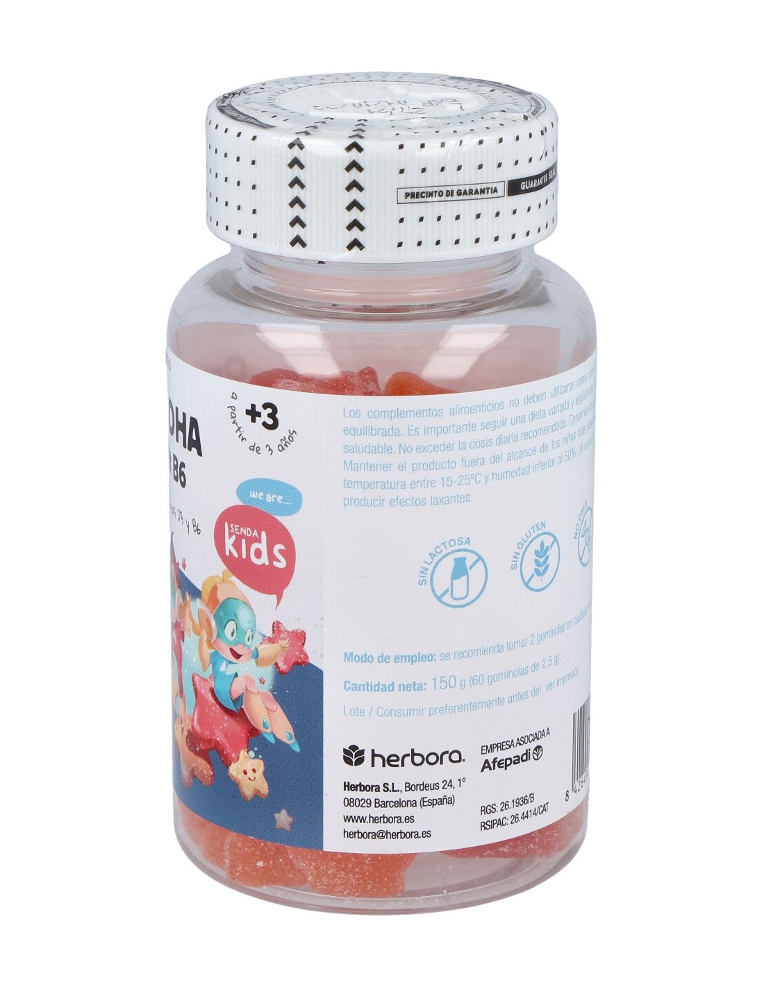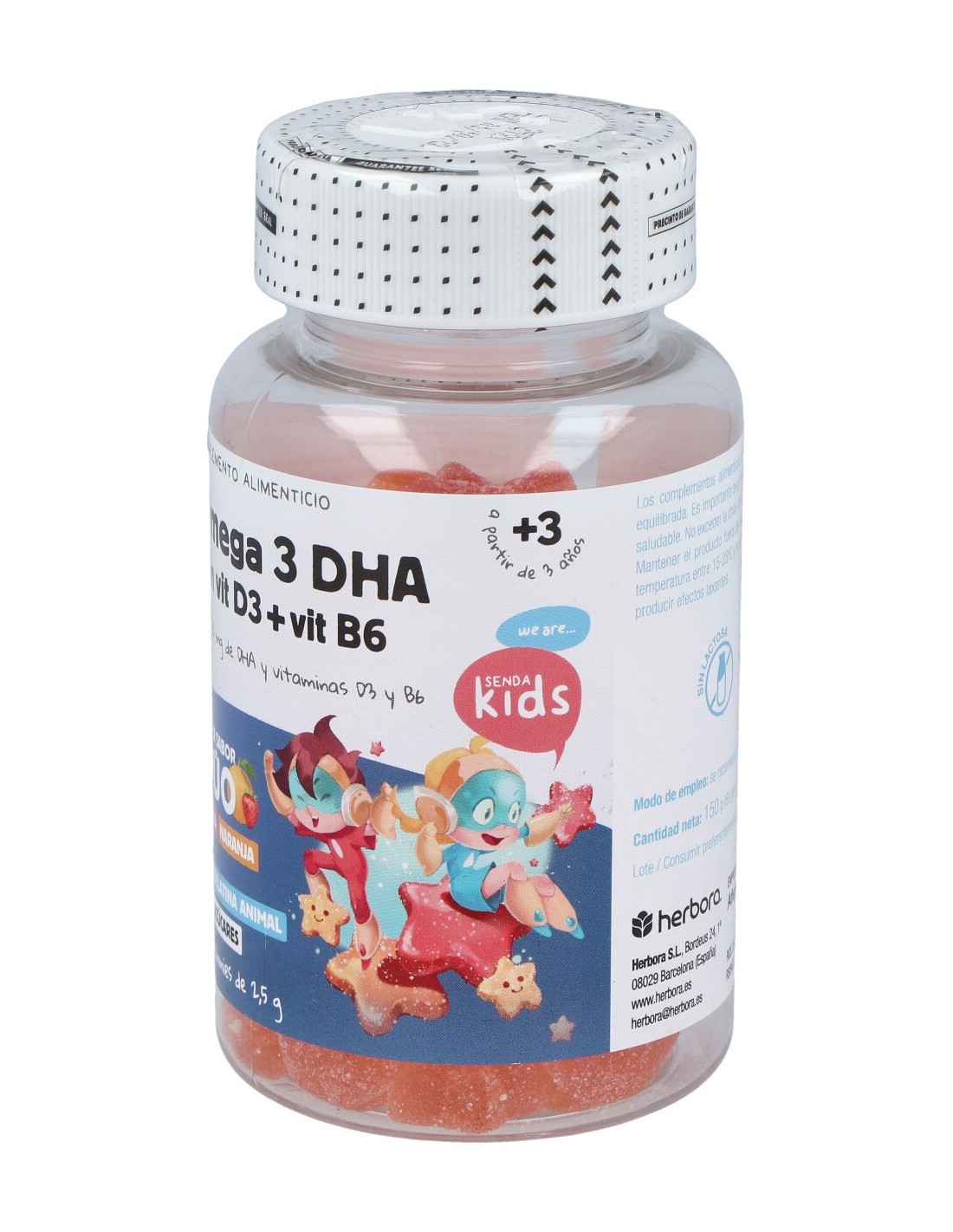Complemento alimenticio especialmente desarrollado para la edad infantil, en forma de divertidas gominolas con sabores a fresa y naranja, elaborado a base de ácidos grasos omega 3 procedente de aceite de algas, muy rico en DHA.