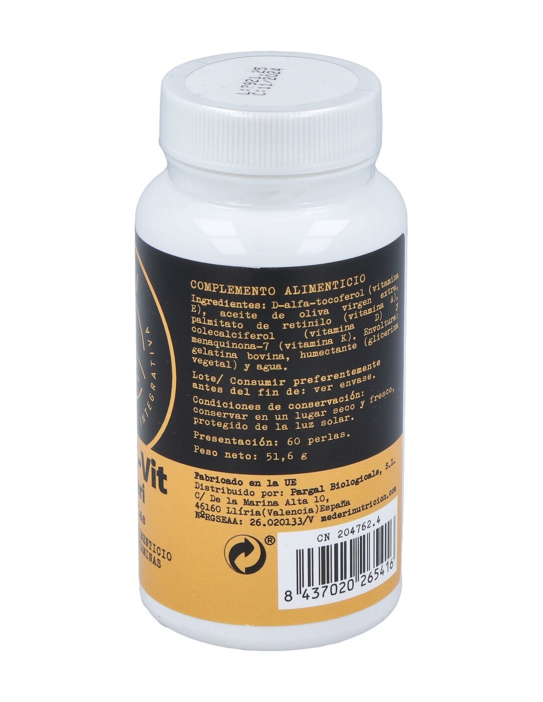 D-alfa-tocoferol (vitamina E), aceite de oliva virgen extra, palmitato de retinilo (vitamina A), colecalciferol (vitamina D) y menaquinona-7 (vitamina K). Envoltura: gelatina bovina, humectante (glicerina vegetal) y agua.