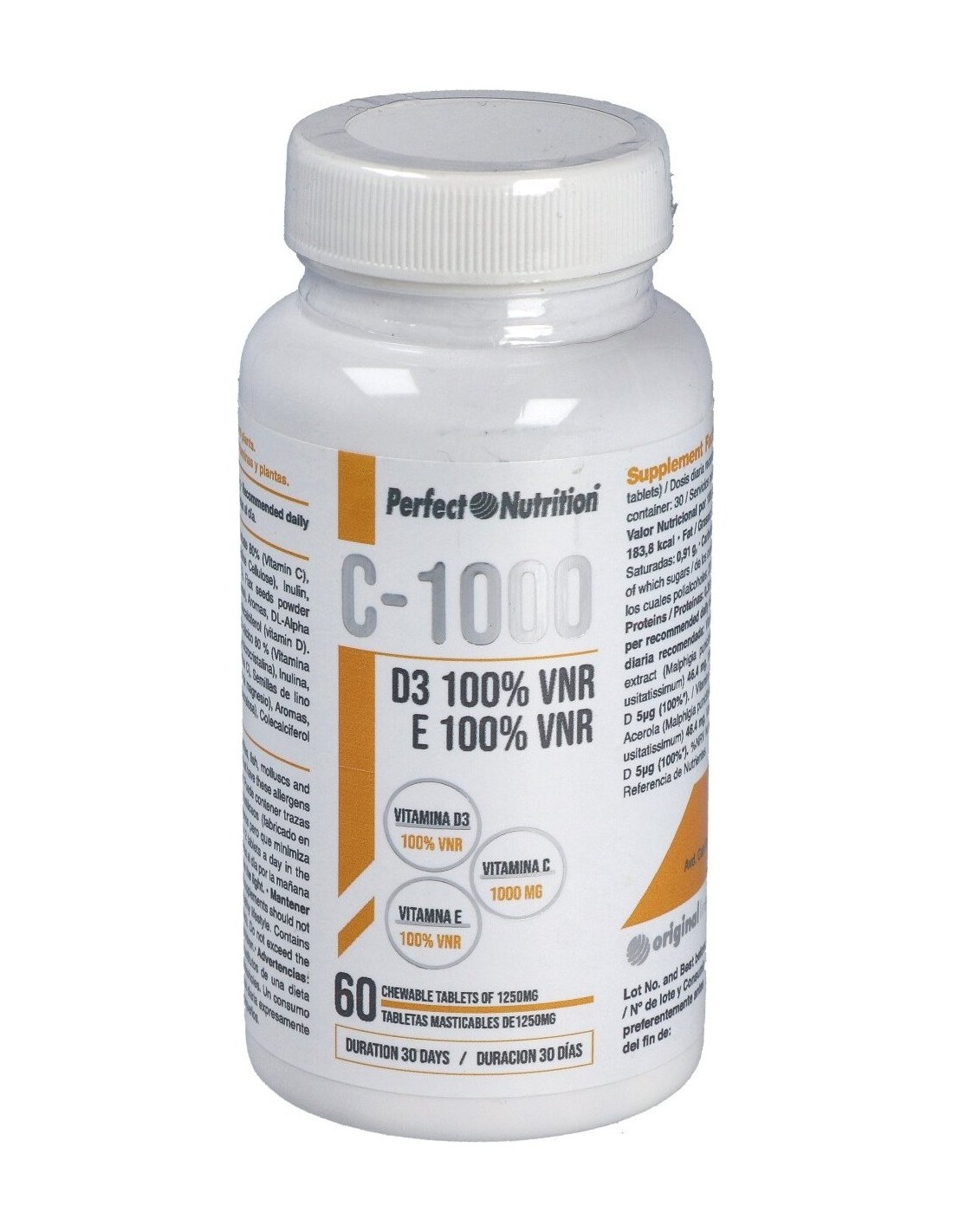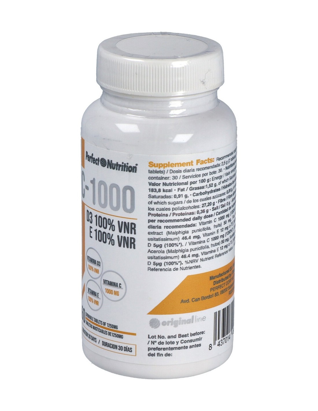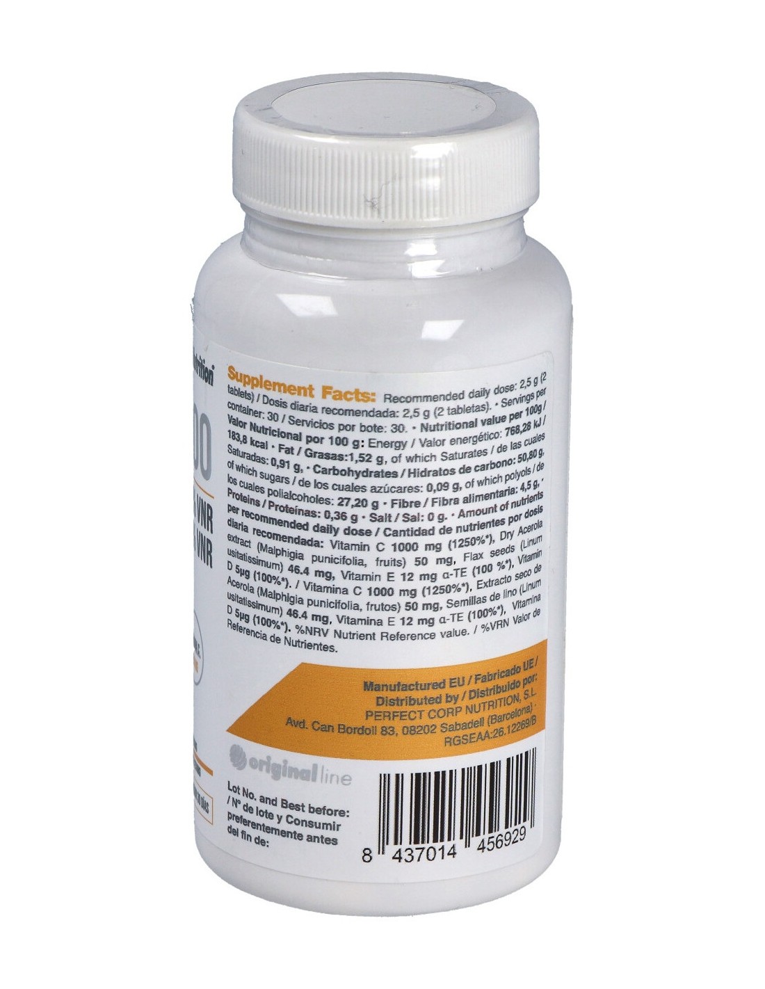 Ácido L-Ascórbico (Vitamina C), L-Ascorbato cálcico 80 % (Vitamina C), Edulcorantes: (Sorbitol, xilitol), Agente de carga: (Celulosa microcristalina), Inulina, Extracto seco de Acerola (Malpighia punicifolia, 50% Vitamina C), Semillas de lino en polvo (Linum usitatissimum), Antiaglomerante: (estearato de magnesio), Aromas, Acetato de DL Alpha tocoferilo (vitamina E), Edulcorante: (Sucralosa), Colecalciferol (Vitamina D)