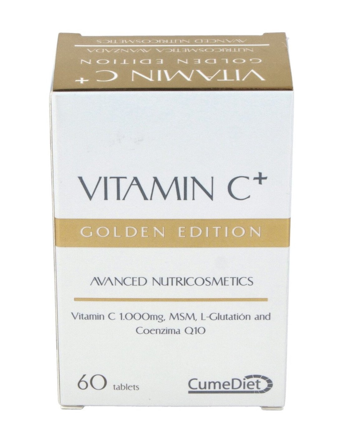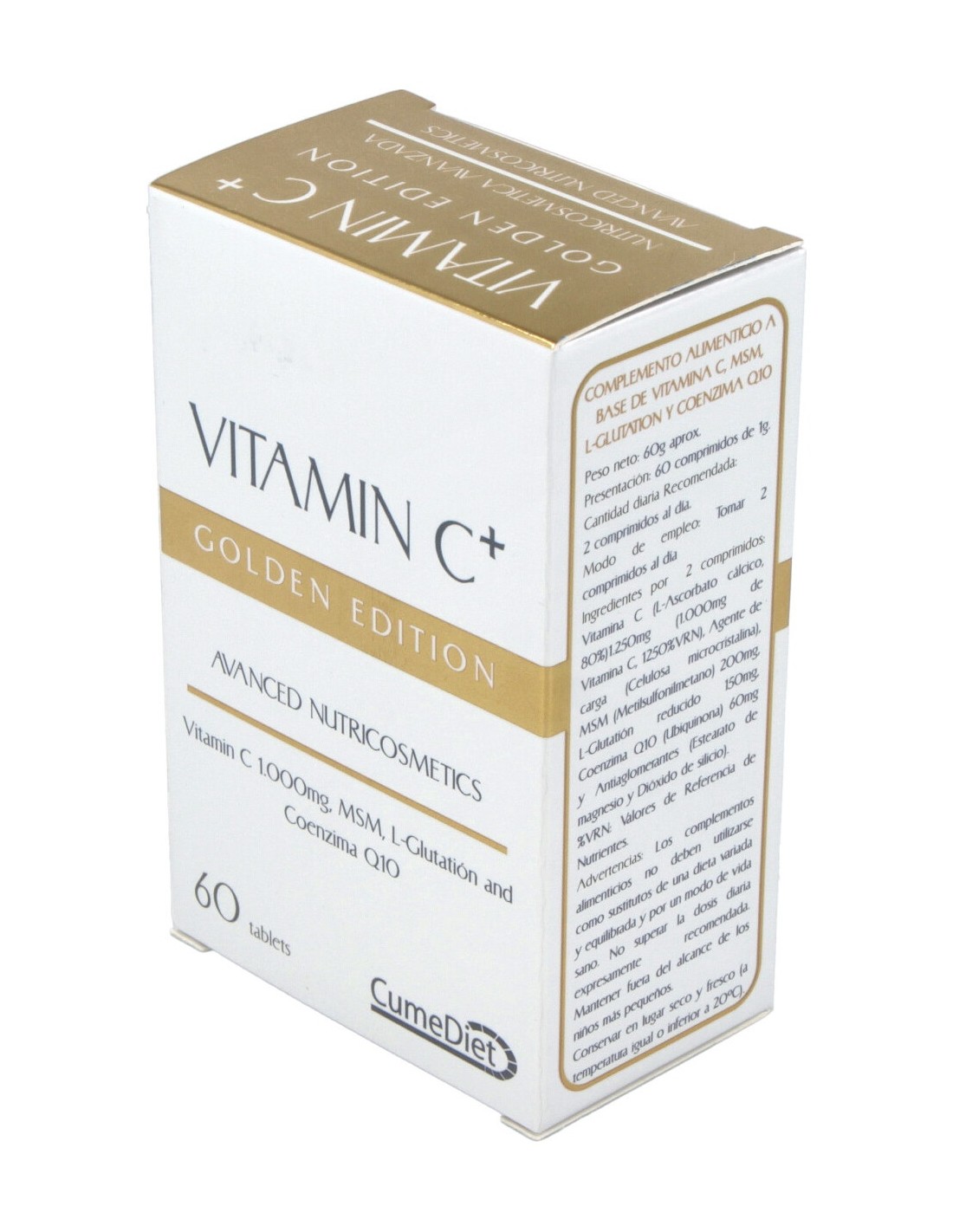 Cumediet Vitamina C+ Golden 60comp comprimidos antioxidantes a base de vitamina c, l glutatión y coenzima q 10. ayuda a prevenir los daños en la piel y a atacar los elementos nocivos. protege del estrés oxidativo reduciendo de manera eficaz los efectos del envejecimiento de la piel. neutraliza los radicales libres y mejora la regeneración de la dermis. interviene en la producción de colágeno en las células cutáneas, ayudando a mantener la estructura de la piel.