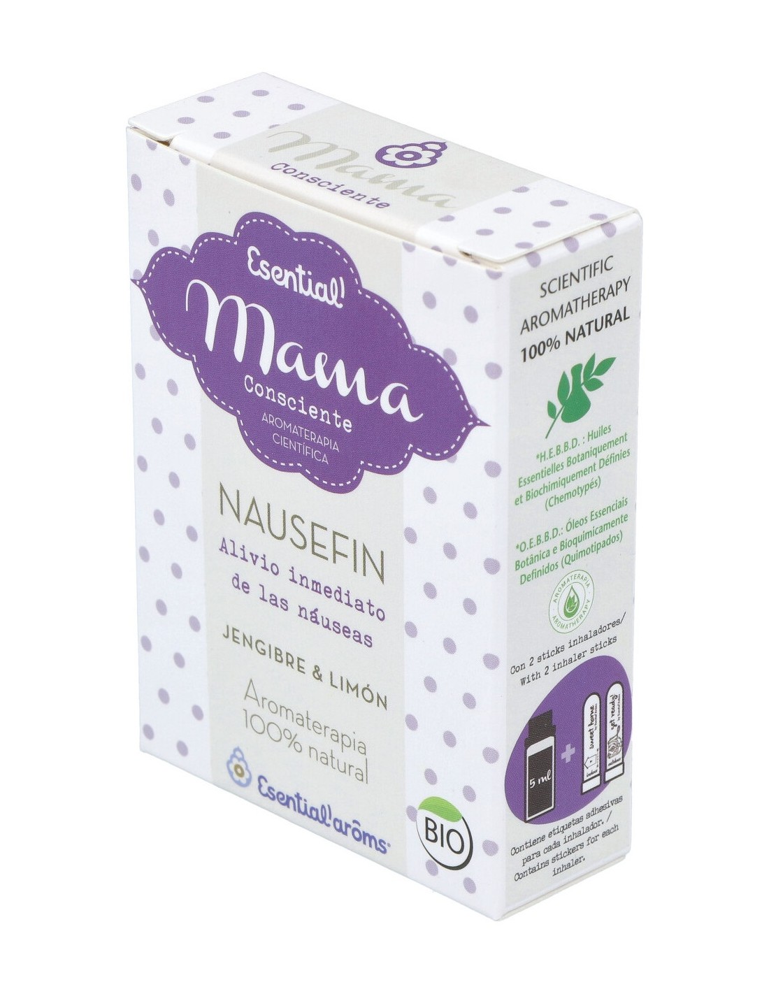 Kit que incluye la solución Nausefin y 2 inhaladores para poder llevar a cualquier parte y utilizar en cualquier momento. Gracias a su fórmula con aceites esenciales puros de limón y de jengibre, esta solución ayuda a reducir la sensación de náusea durante el embarazo al ser inhalado.