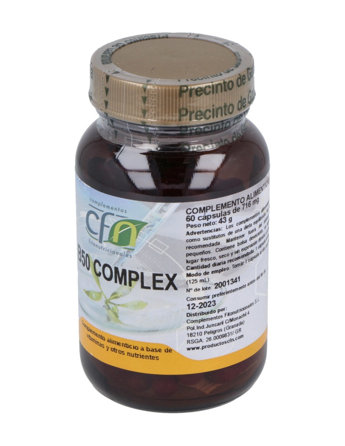 Ingredientes por cápsula : Vitamina B1 50 mg Vitamina B2 50 mg Vitamina B6 50 mg Vitamina B12 25 mcg Niacina/Niacinamida 50 mg Ácido fólico 500 mcg Ácido pantoténico 50 mg Biotina 50 mcg Colina bitartrato 50 mg Inositol 50 mg PABA 50 mg Bioflavonoides cítricos (60% hesperidina). Citrus Sinenis 3,3 mg