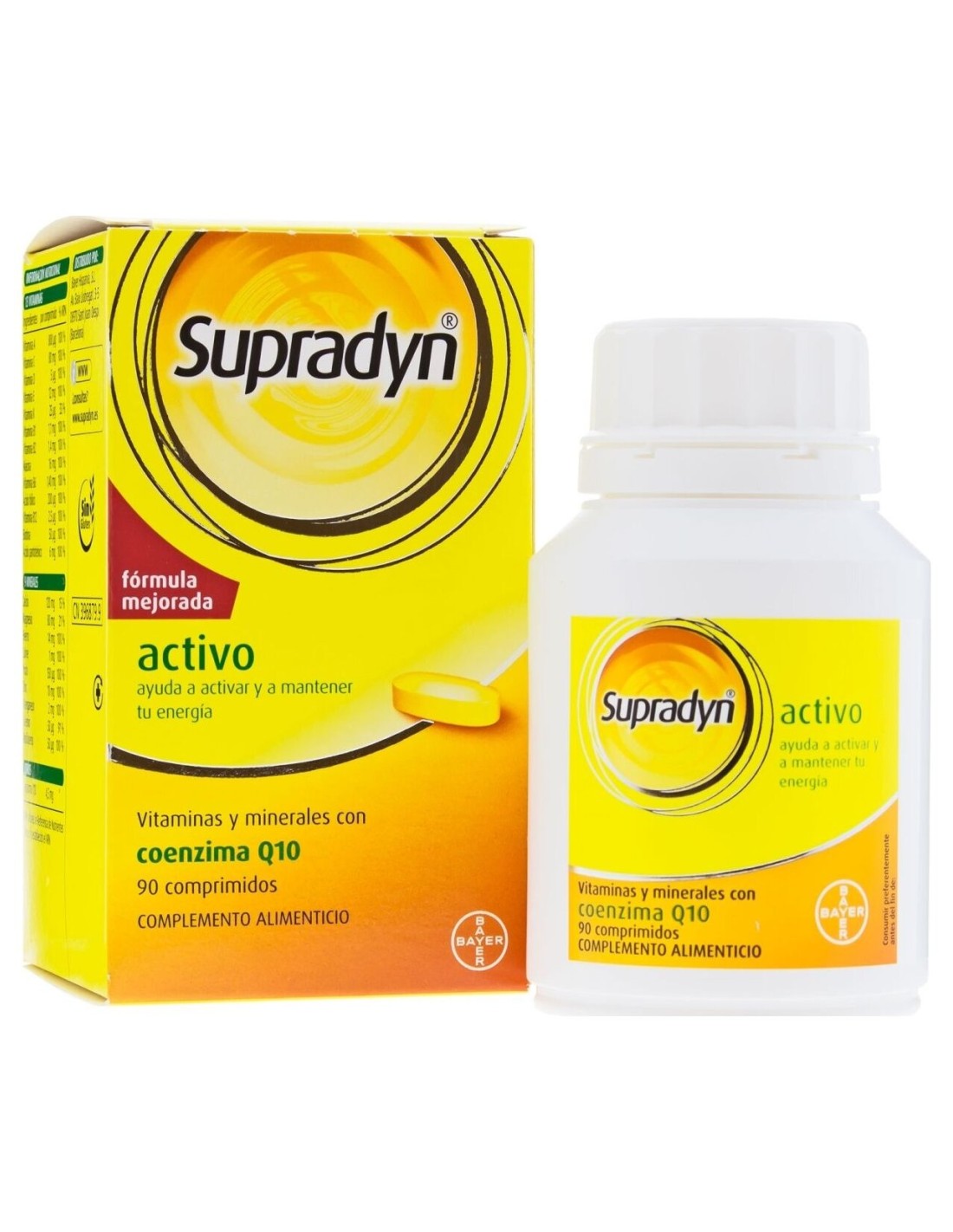 Bayer Supradyn® Activo 90comp es un complemento polivitamínico con minerales, que ayuda a activar y mantener la energía y vitalidad durante todo el día. Su fórmula combina 13 vitaminas, 9 minerales y Coenzima Q10. Las vitaminas del grupo B (B2, B6 y B12), ayudan al metabolismo energético normal y a reducir el cansancio y la fatiga. Las vitaminas C y E actúan como antioxidantes, protegiendo las células frente al daño oxidativo. Estos comprimidos estan indicados para personas activas mayores de años de edad.