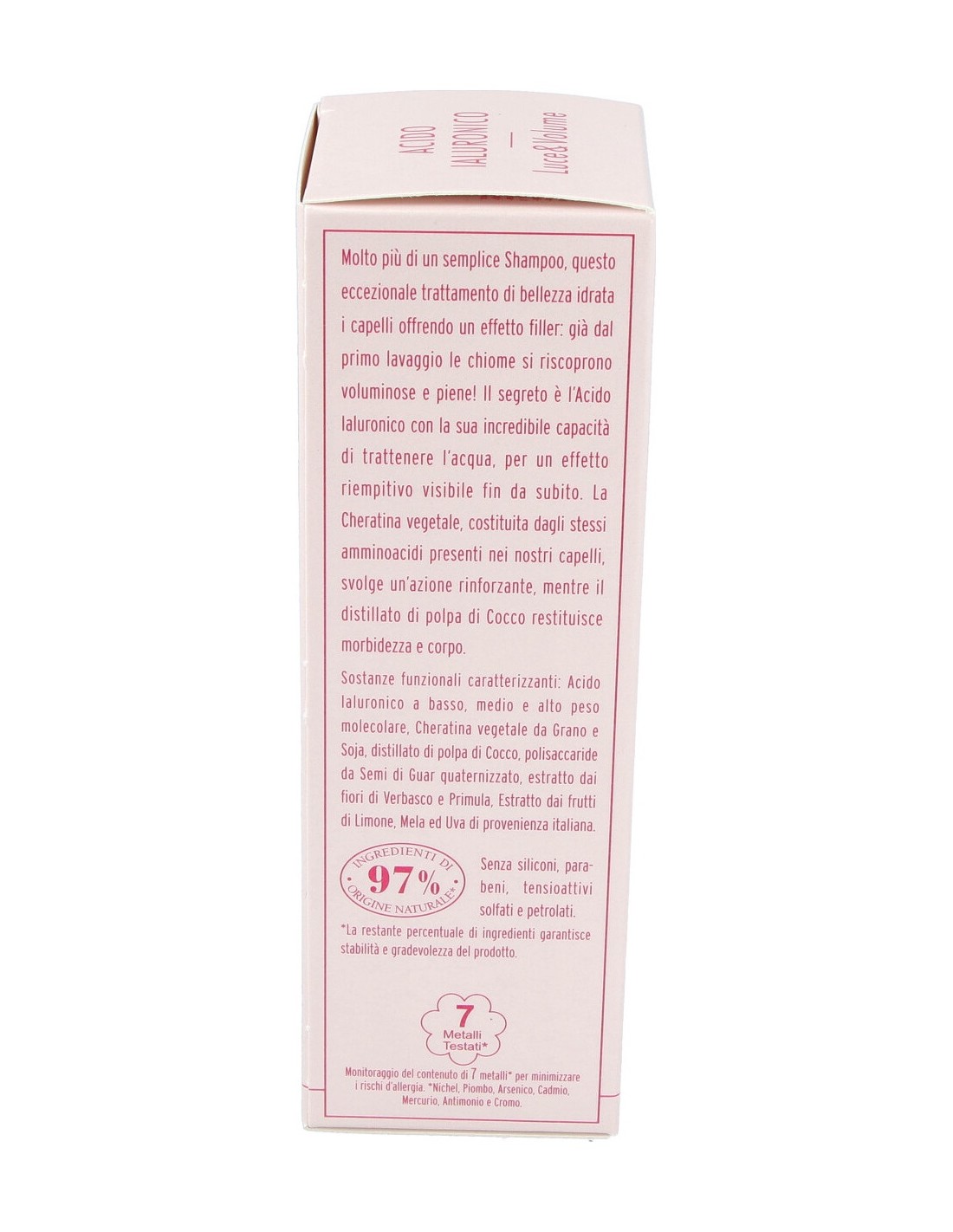 De efecto relleno gracia sal ácido hialurónico. La queratina vegetal, formada por los mismos aminoácidos presentes en el cabello, tiene una acción fortalecedora, mientras que el destilado de pulpa de coco devuelve suavidad y cuerpo. Sin siliconas, tensioactivos de sulfato, parabenos, colorantes ni vaselina.